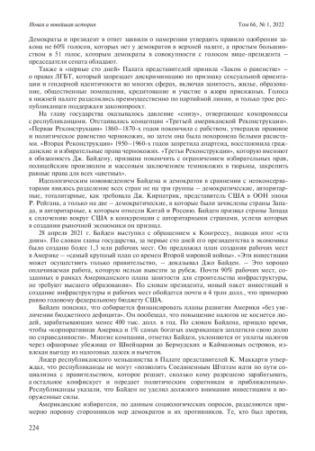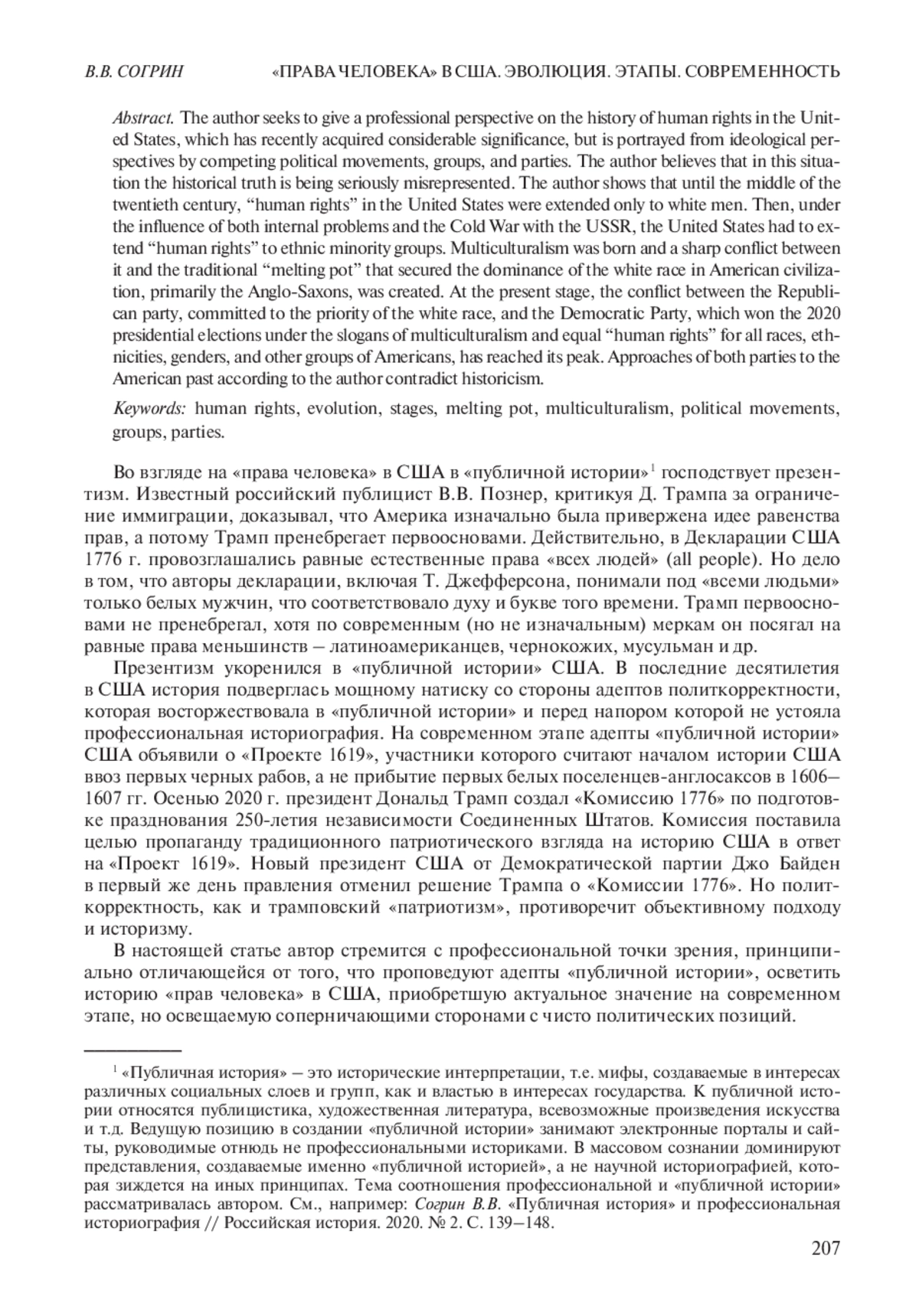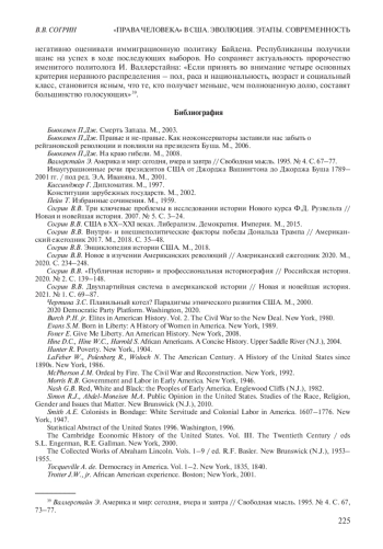 Автор стремится с профессиональной точки зрения осветить историю «прав человека» в США, приобретшую актуальное значение на современном этапе, но освещаемую соперничающими сторонами с идеологических позиций. Идеологизированные подходы обеих партий к американскому прошлому, по мнению автора, противоречат объективной картине и историзму. Автор показывает, что, несмотря на важные изменения (прежде всего Гражданскую войну 1861–1865 гг. и Реконструкцию Юга), до середины ХХ в. «права человека» в США в полном объеме распространялись только на мужчин – представителей белой расы. Затем под воздействием как внутренних проблем, так и холодной войны с СССР США провозглашали свое стремление распространить «права человека» на небелые расы и этносы. Зародились мультикультурализм и острый конфликт между ним и традиционными представлениями о «плавильном котле», закреплявшими господство в американской цивилизации за белой расой, в первую очередь англосаксами. На современном этапе достиг пика конфликт между Республиканской партией, приверженной приоритету белой расы, и Демократической партией, победившей на президентских выборах 2020 г. под лозунгами мультикультурализма и равных «прав человека» для всех рас, этносов, гендерных и иных групп американцев. В то же время в статье показывается и активное сопротивление многих американцев подобному подходу. Неудивительно, что многие мероприятия президента Д. Трампа в духе неоконсерватизма под давлением республиканцев во многом были продолжены его преемником Дж. Байденом