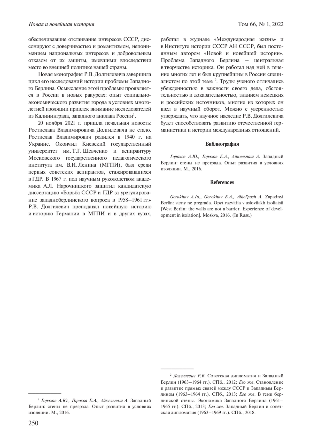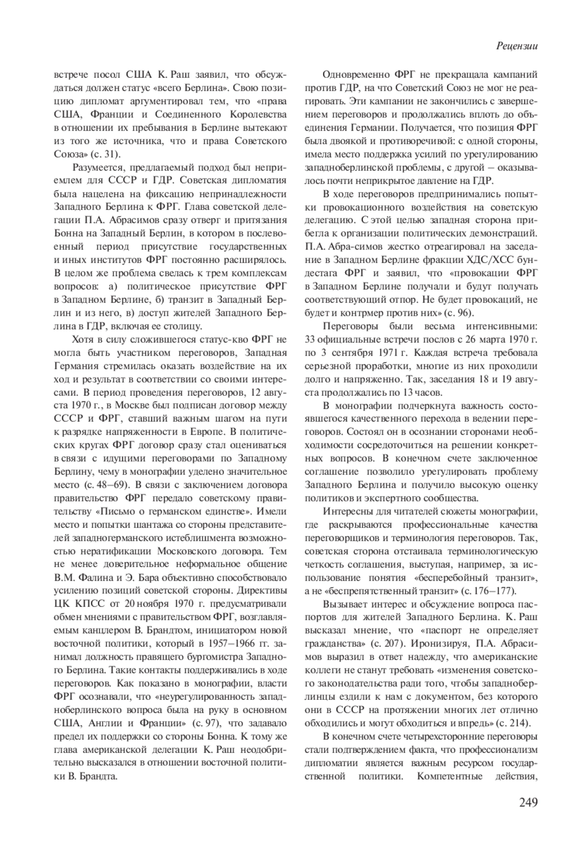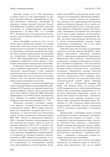 БЕЛОЗЁРОВ В. К. ИСКУССТВО ПЕРЕГОВОРОВ И РЕШЕНИЕ БЕРЛИНСКОГО ВОПРОСА (Р. В. ДОЛГИЛЕВИЧ. СОВЕТСКАЯ ДИПЛОМАТИЯ НА ЧЕТЫРЕХСТОРОННИХ ПЕРЕГОВОРАХ ПО ЗАПАДНОМУ БЕРЛИНУ (26 МАРТА 1970 Г. - 3 СЕНТЯБРЯ 1971 Г.) / ПРЕДИСЛ. И ПУБЛ. Р. В. ДОЛГИЛЕВИЧ. СПБ., 2021) // НОВАЯ И НОВЕЙШАЯ ИСТОРИЯ. 2022. № 1