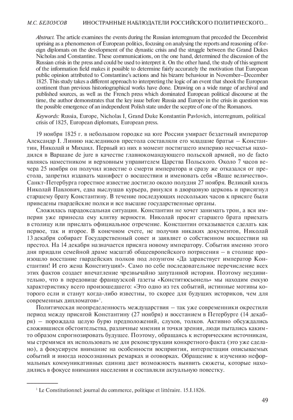 В предлагаемой статье рассматриваются события российского междуцарствия, предшествовавшего восстанию декабристов, как явления европейской политики, так как основное внимание сосредоточено на анализе донесений и рассуждений иностранных дипломатов из частной переписки и мемуаров о развитии династического кризиса и борьбе между великими князьями Николаем и Константином Павловичами. Сообщения дипломатов нередко становились известны не только политикам, но и журналистам. Опираясь на полученные факты, публицисты предлагали собственную достаточно часто более смелую интерпретацию причин и логики развития российского политического кризиса. Кроме того, исследование этого сегмента информационного поля дает возможность достаточно четко выстроить, какую мотивировку европейское общественное мнение приписывало поступкам Константина Павловича и его «странному» поведению в ноябре–декабре 1825 г. Реализация обозначенных векторов дает возможность иначе интерпретировать логику события, потрясшего весь Европейский континент, чем это было сделано в предшествующей историографии. Опираясь на широкий круг архивных и опубликованных источников, а также материалов французской прессы, определявшей в данную эпоху европейский политический дискурс, в статье показано, что ключевой проблемой, стоявшей перед Россией и Европой, в рассматриваемом кризисе был вопрос о возможном возникновении независимого польского государства под скипетром одного из Романовых.