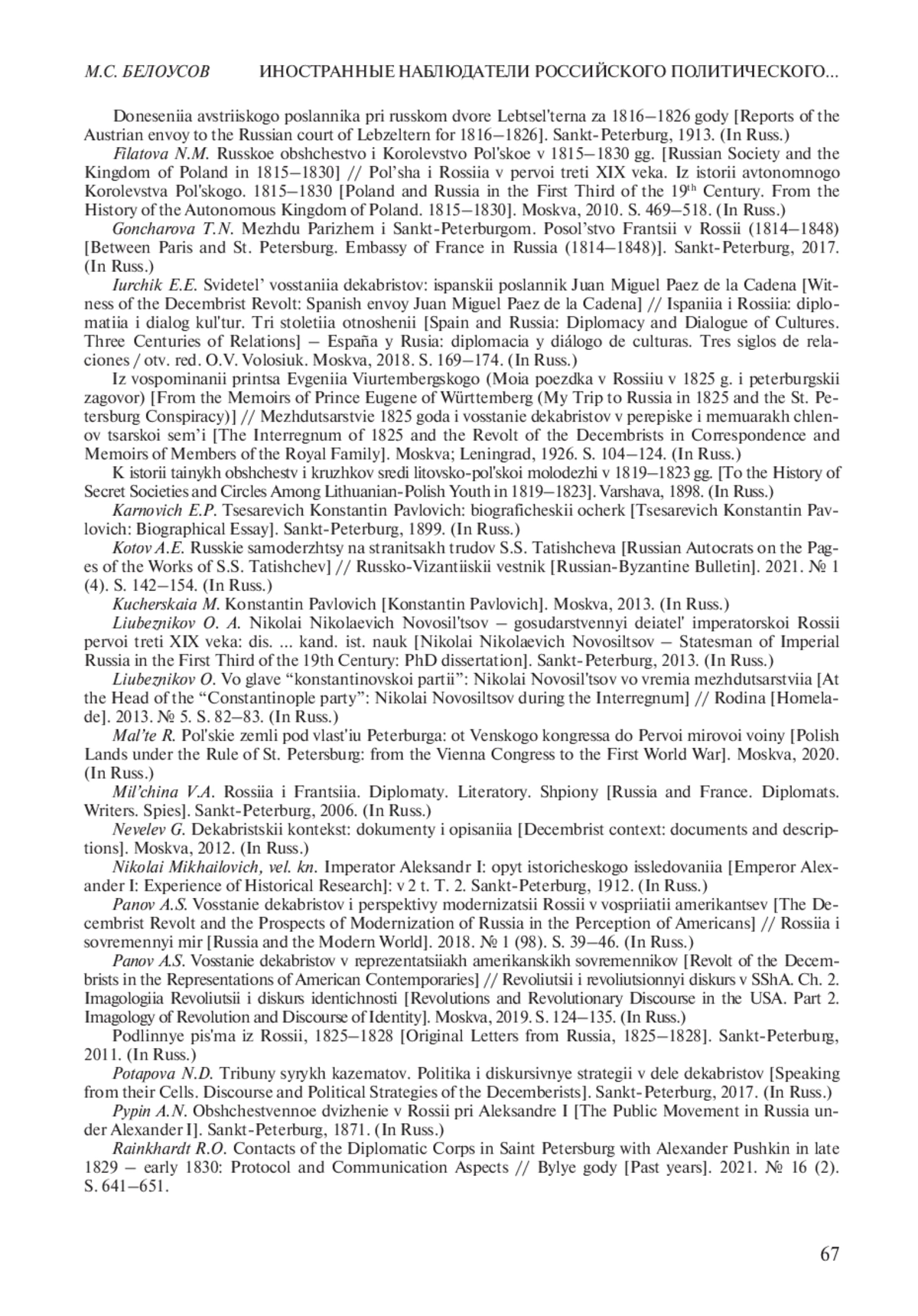 30. Райнхардт Р.О. Contacts of the Diplomatic Corps in Saint Petersburg with Alexander Pushkin in late 1829 - early 1830: Protocol and Communication Aspects // Былые годы. 2021. № 16 (2). С. 641-651. EDN: APQIAK