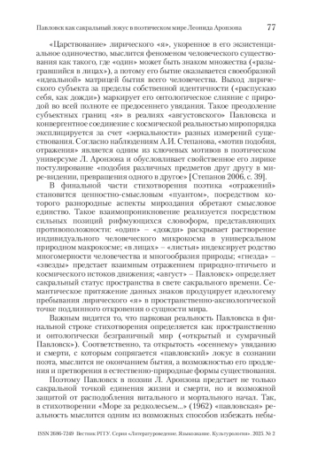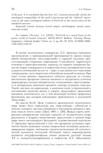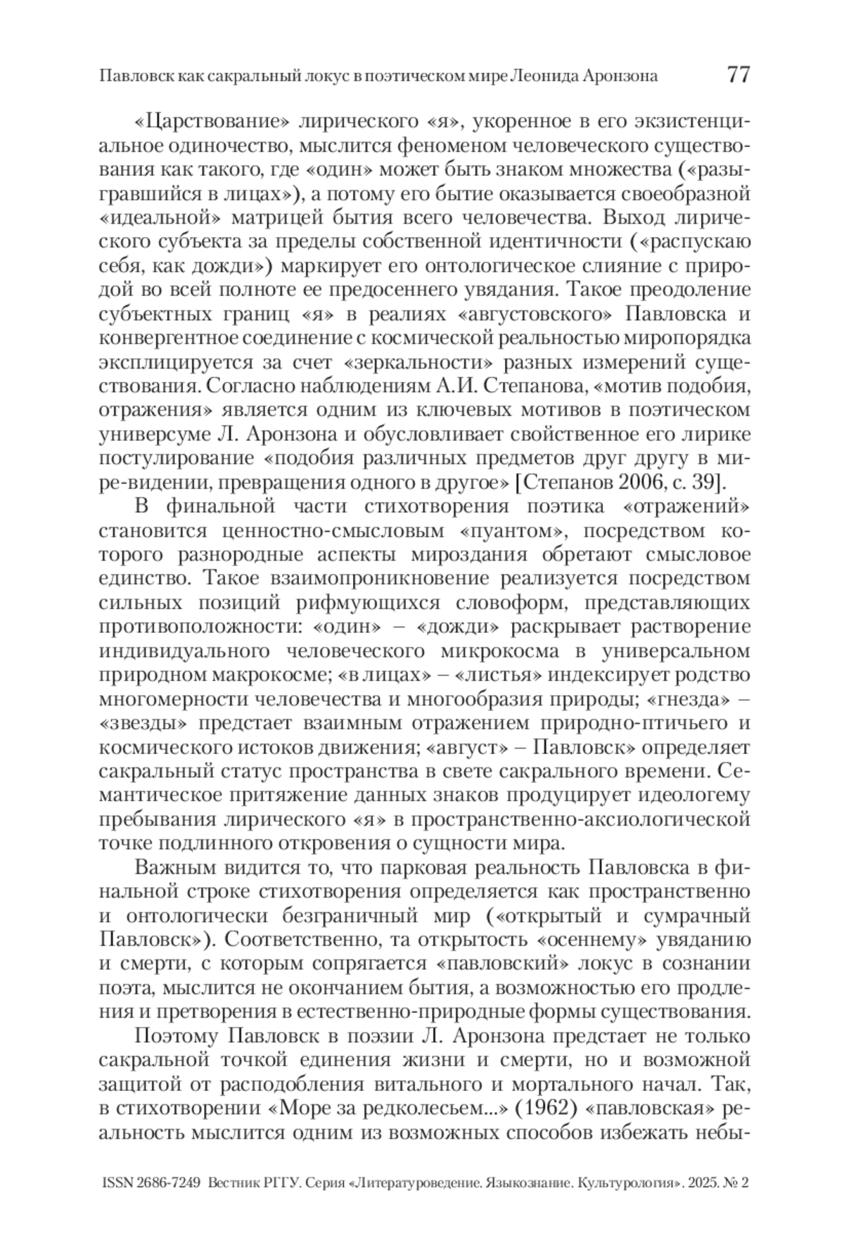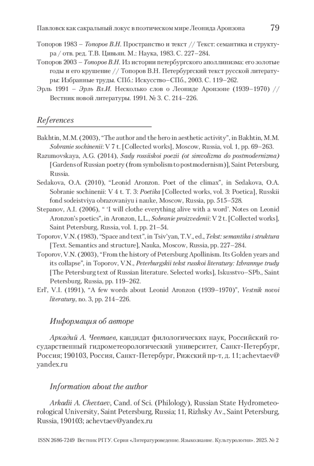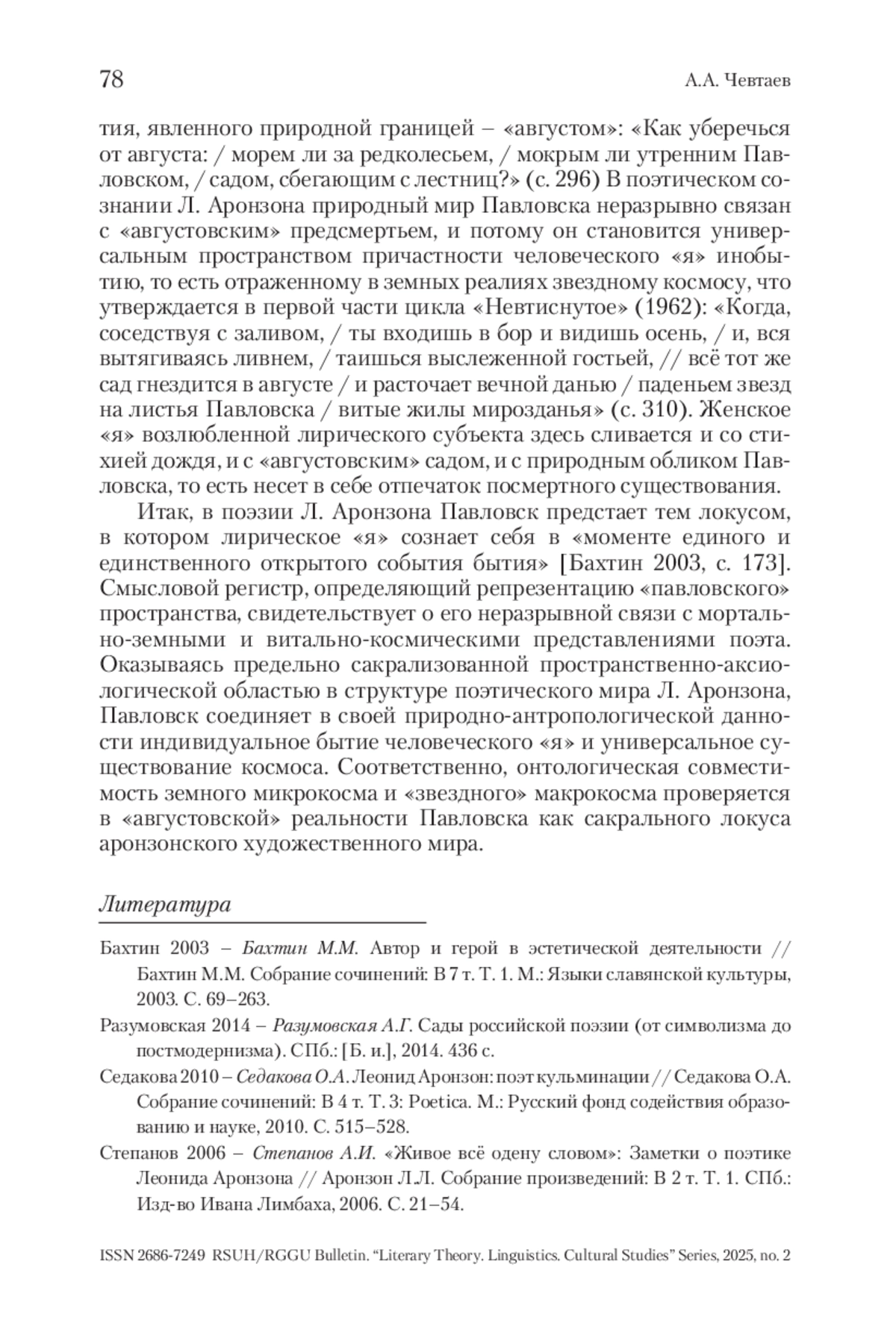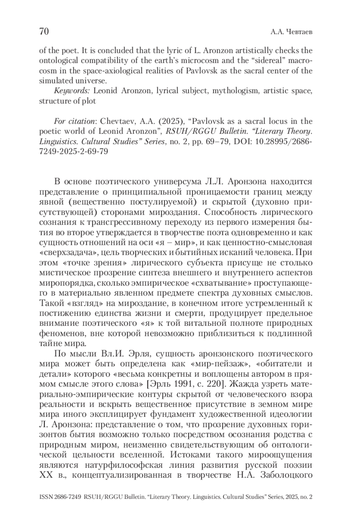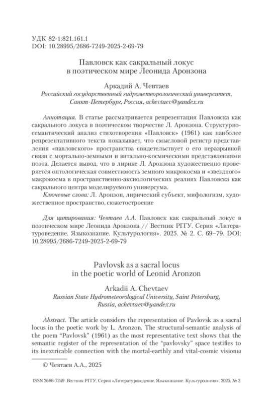 ЧЕВТАЕВ А. А. ПАВЛОВСК КАК САКРАЛЬНЫЙ ЛОКУС В ПОЭТИЧЕСКОМ МИРЕ ЛЕОНИДА АРОНЗОНА // ВЕСТНИК РГГУ. СЕРИЯ «ЛИТЕРАТУРОВЕДЕНИЕ. ЯЗЫКОЗНАНИЕ. КУЛЬТУРОЛОГИЯ». 2025. № 2