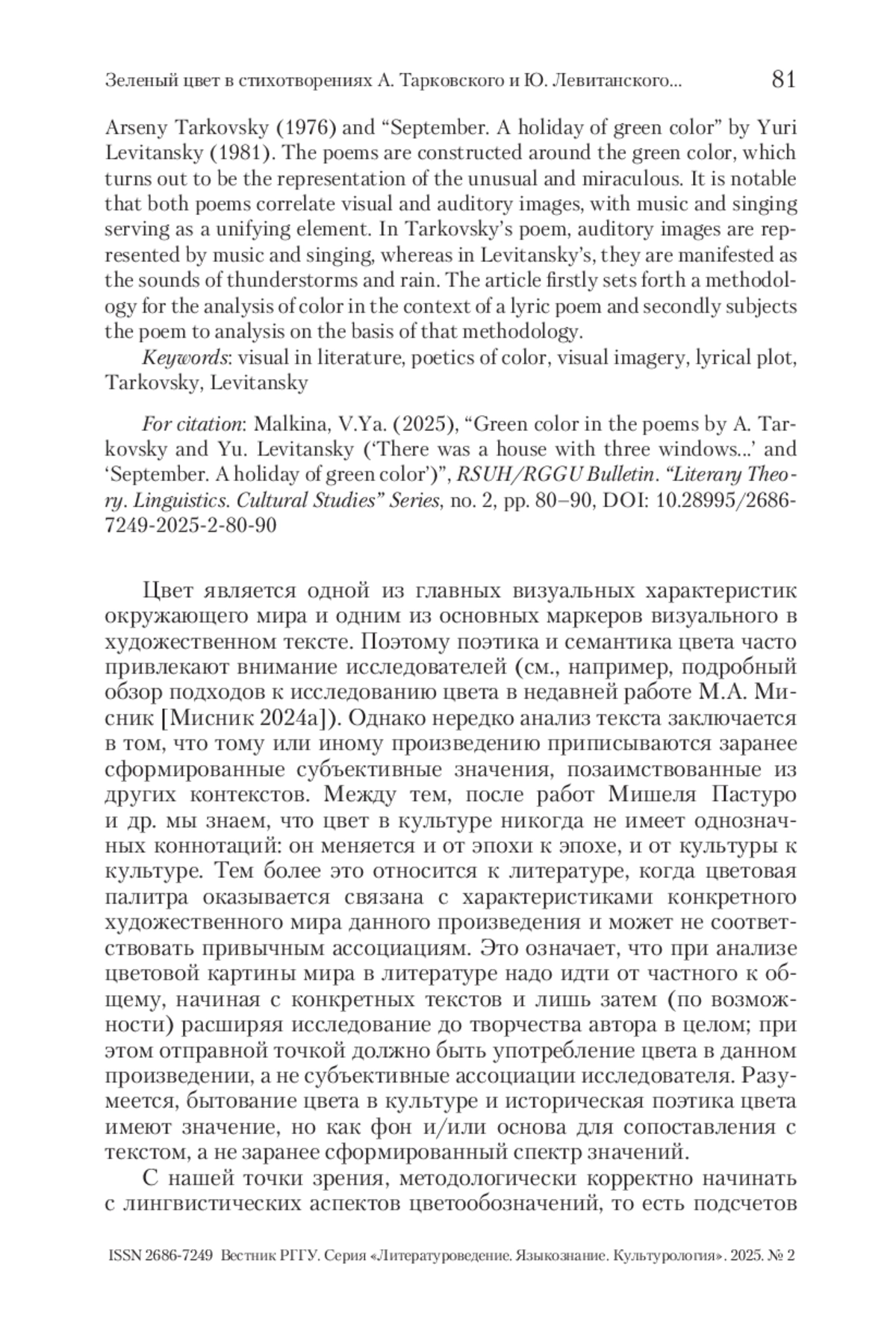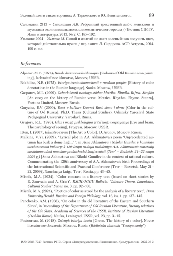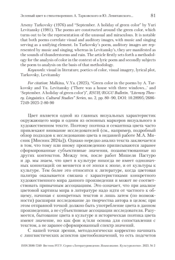 МАЛКИНА В. Я. ЗЕЛЕНЫЙ ЦВЕТ В СТИХОТВОРЕНИЯХ А. ТАРКОВСКОГО И Ю. ЛЕВИТАНСКОГО («БЫЛ ДОМИК В ТРИ ОКОНЦА…» И «СЕНТЯБРЬ. ПРАЗДНИК ЗЕЛЕНОГО ЦВЕТА») // ВЕСТНИК РГГУ. СЕРИЯ «ЛИТЕРАТУРОВЕДЕНИЕ. ЯЗЫКОЗНАНИЕ. КУЛЬТУРОЛОГИЯ». 2025. № 2