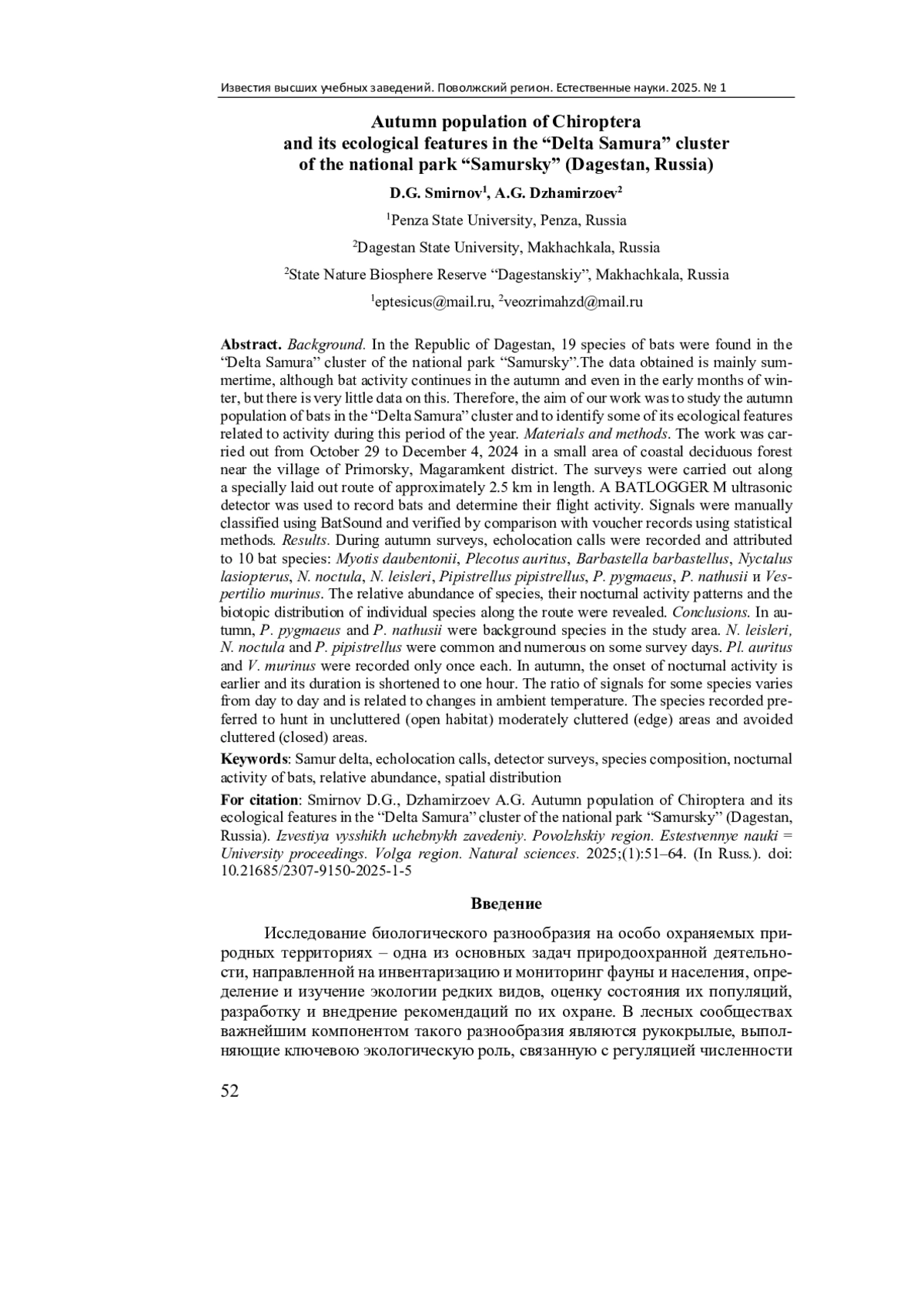 Актуальность и цели. В Республике Дагестан на территории кластера «Дельта Самура» национального парка «Самурский» предыдущими исследованиями установлено обитание 19 видов рукокрылых. Полученные сведения в основном относятся к летнему времени, тогда как активность рукокрылых продолжается и в осенние сроки и даже в первый месяц зимы, однако данных об этом крайне мало. В связи с этим целью нашей работы было изучение осеннего населения рукокрылых кластера «Дельта Самура» и выявление некоторых его экологических особенностей, связанных с активностью в этот период года. Материалы и методы. Работы проводили с 29 октября по 4 декабря 2024 г. на небольшом участке прибрежного лиственного леса, расположенном в окрестности с. Приморский Магарамкентского р-на. Учеты вели на специально заложенном маршруте, протяженностью около 2,5 км. Для регистрации рукокрылых и определения их полетной активности использовали ультразвуковой детектор BATLOGGER M. Классификацию сигналов проводили вручную с помощью BatSound, а верификацию путем сравнения с ваучерными записями статистическими методами. Результаты. В ходе осенних учетов были зарегистрированы эхолокационные сигналы, которые отнесены к 10 видам рукокрылых: Myotis daubentonii, Plecotus auritus, Barbastella barbastellus, Nyctalus lasiopterus, N. noctula, N. leisleri, Pipistrellus pipistrellus, P. pygmaeus, P. Nathusii и Vespertilio murinus. Выявлены относительное обилие видов, характер их ночной активности и биотопическое распределение отдельных видов на маршруте. Выводы. Осенью в районе проведения работ фоновыми видами являлись P. pygmaeus и P. nathusii. Обычными, а в некоторые дни учетов и многочисленными были N. leisleri, N. noctula и P. pipistrellus. Лишь по одной записи сделано Pl. auritus и V. murinus. Осенью начало ночной активности сдвинуто на более раннее время, а ее продолжительность сокращена в среднем до двух часов. Численное соотношение сигналов у некоторых видов менялось по дням и было связано с изменениями температуры окружающей среды. В биотопическом отношении зарегистрированные виды предпочитали охотиться на открытых и полуоткрытых пространствах и избегали закрытых.