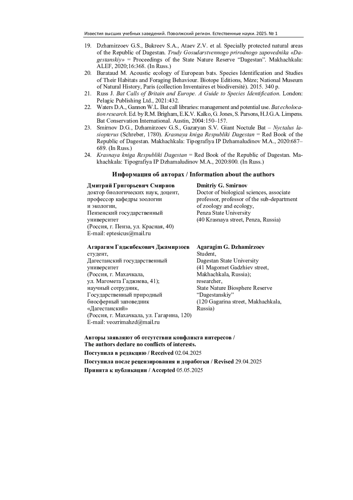 7. Смирнов Д. Г., Джамирзоев Г. С., Вехник В. П., Быков Ю. А. Редкие и малоизученные виды рукокрылых федеральных ООПТ Республики Дагестан // Труды Мордовского государственного природного заповедника имени П. Г. Смидовича. Саранск: Заповедная Мордовия, 2021. Вып. 29. С. 391-401.