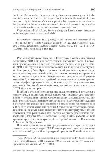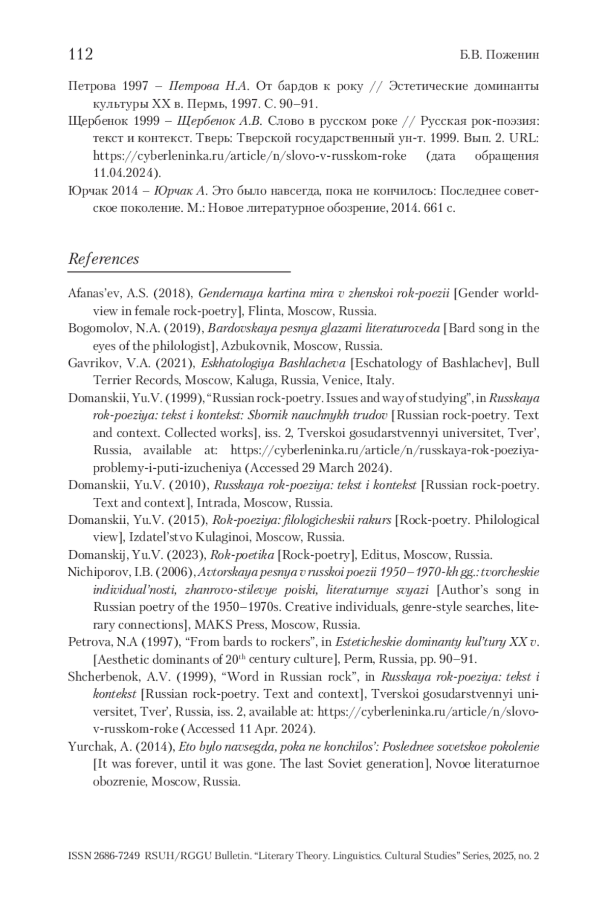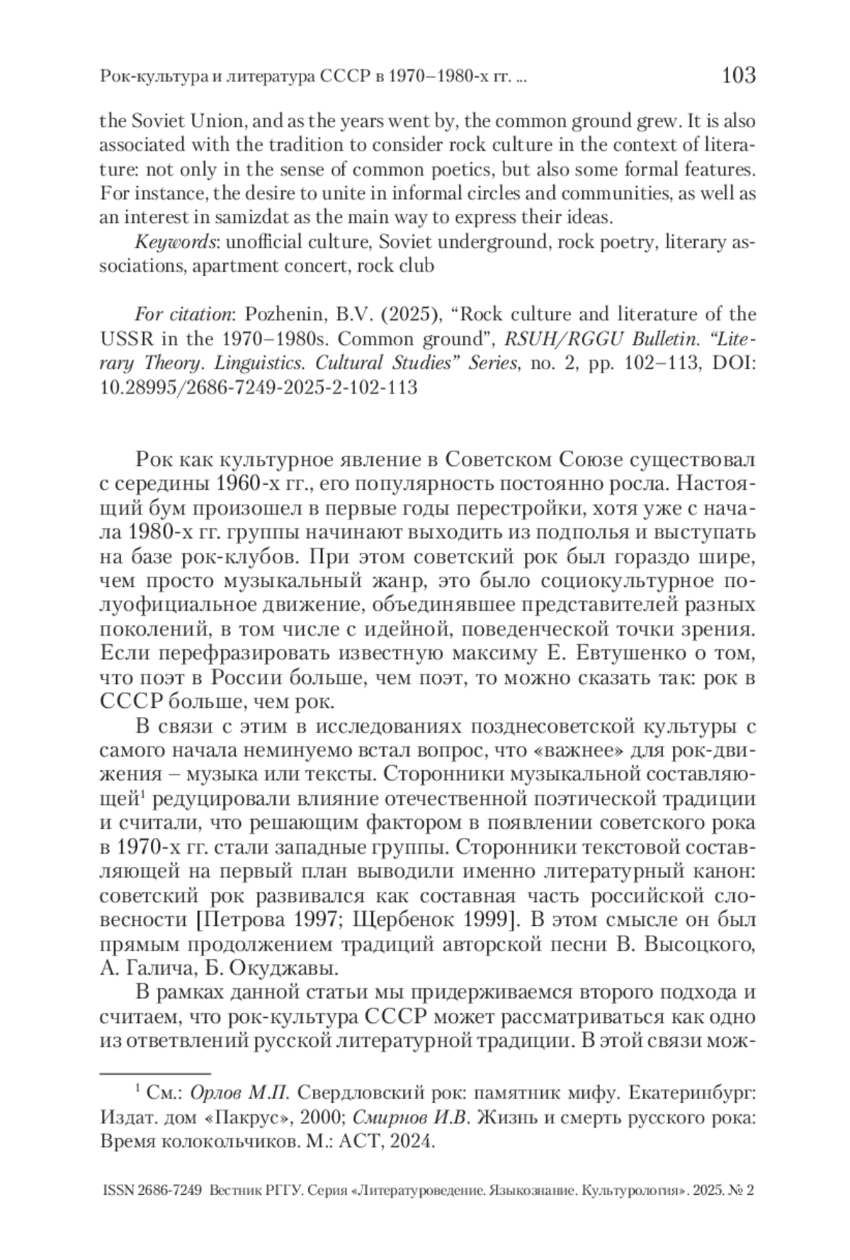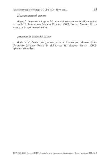 ПОЖЕНИН Б. В. РОК-КУЛЬТУРА И ЛИТЕРАТУРА СССР В 1970–1980-Х ГГ.: ТОЧКИ СОПРИКОСНОВЕНИЯ // ВЕСТНИК РГГУ. СЕРИЯ «ЛИТЕРАТУРОВЕДЕНИЕ. ЯЗЫКОЗНАНИЕ. КУЛЬТУРОЛОГИЯ». 2025. № 2