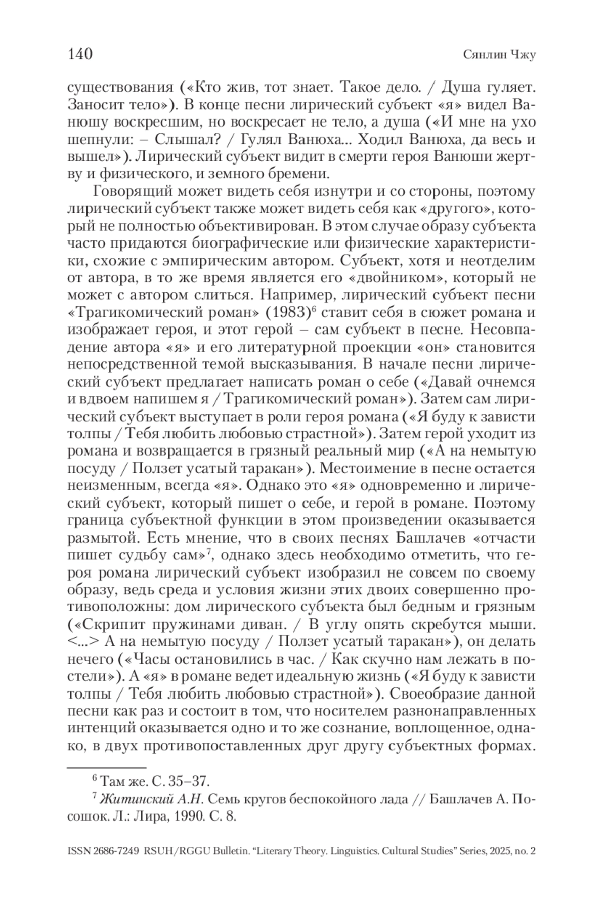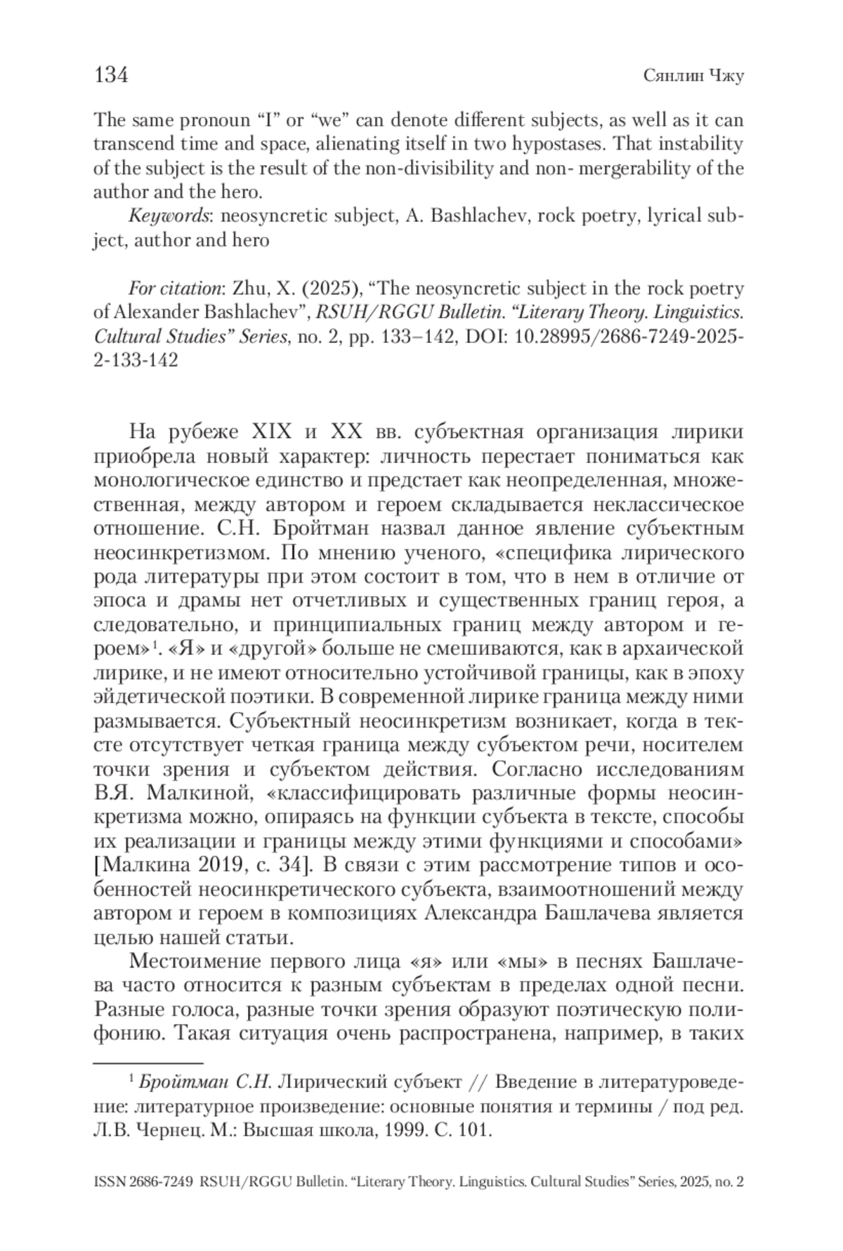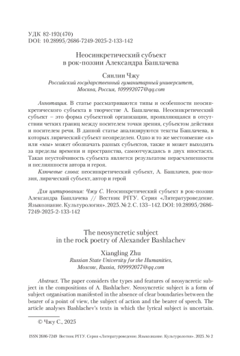 В статье рассматриваются типы и особенности неосинкретического субъекта в творчестве А. Башлачева. Неосинкретический субъект – это форма субъектной организации, проявляющаяся в отсутствии четких границ между носителем точки зрения, субъектом действия и носителем речи. В данной статье анализируются тексты Башлачева, в которых лирический субъект неопределен. Одно и то же местоимение «я» или «мы» может обозначать разных субъектов, также и может выходить за пределы времени и пространства, самоотчуждаясь в двух ипостасях. Такая неустойчивость субъекта является результатом нерасчлененности и неслиянности автора и героя.