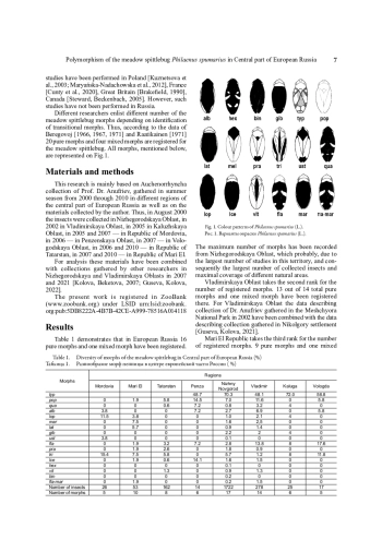 9. Guseva A.D., Kolova U.V. 2022. [Polimorfizm Philaenus spumarius (L.) (Auchenorrhyncha: Aphrophoridae) v czentre Vostochno-Evropejskoj ravniny’] // [Biosistemy’: organizacziya, povedenie, upravlenie: Tezisy’ dokladov 75-j Vserossijskoj s mezhdunarodny’m uchastiem shkoly’-konferenczii molody’kh ucheny’kh]. Nizhnii Novgorod 19-22 Apil 2022. P.57. [In Russian].