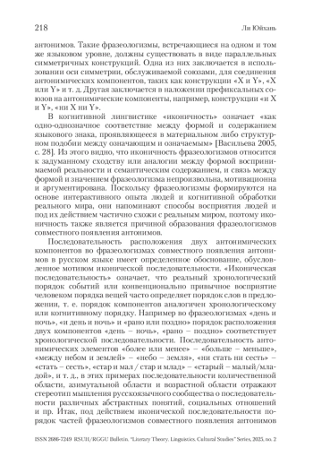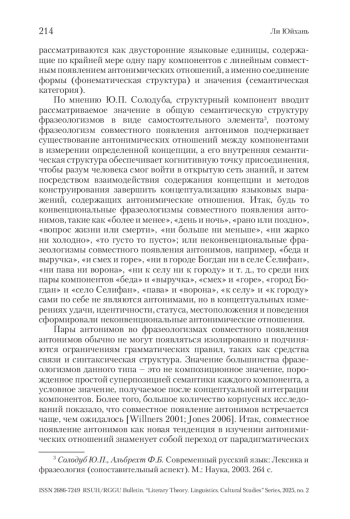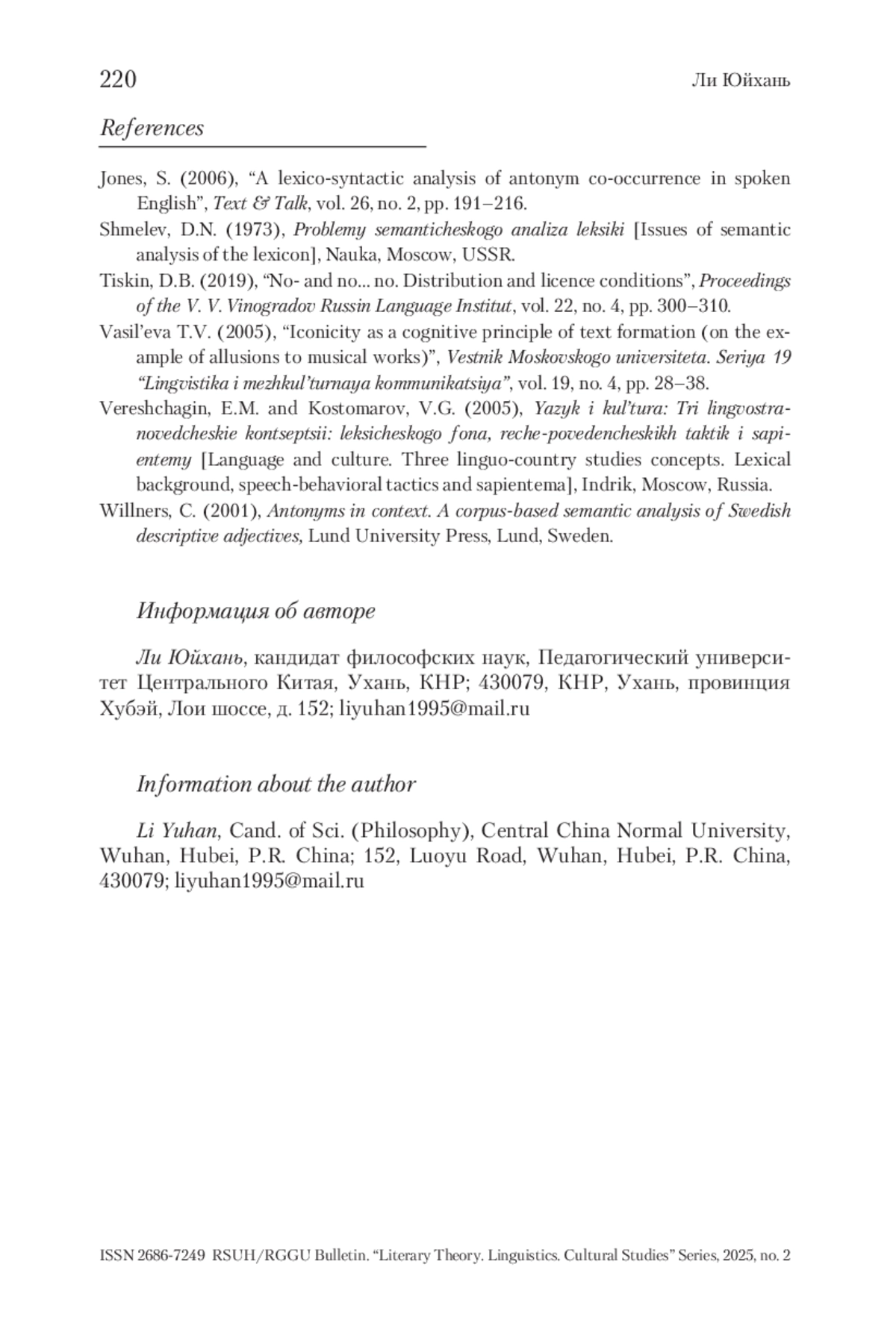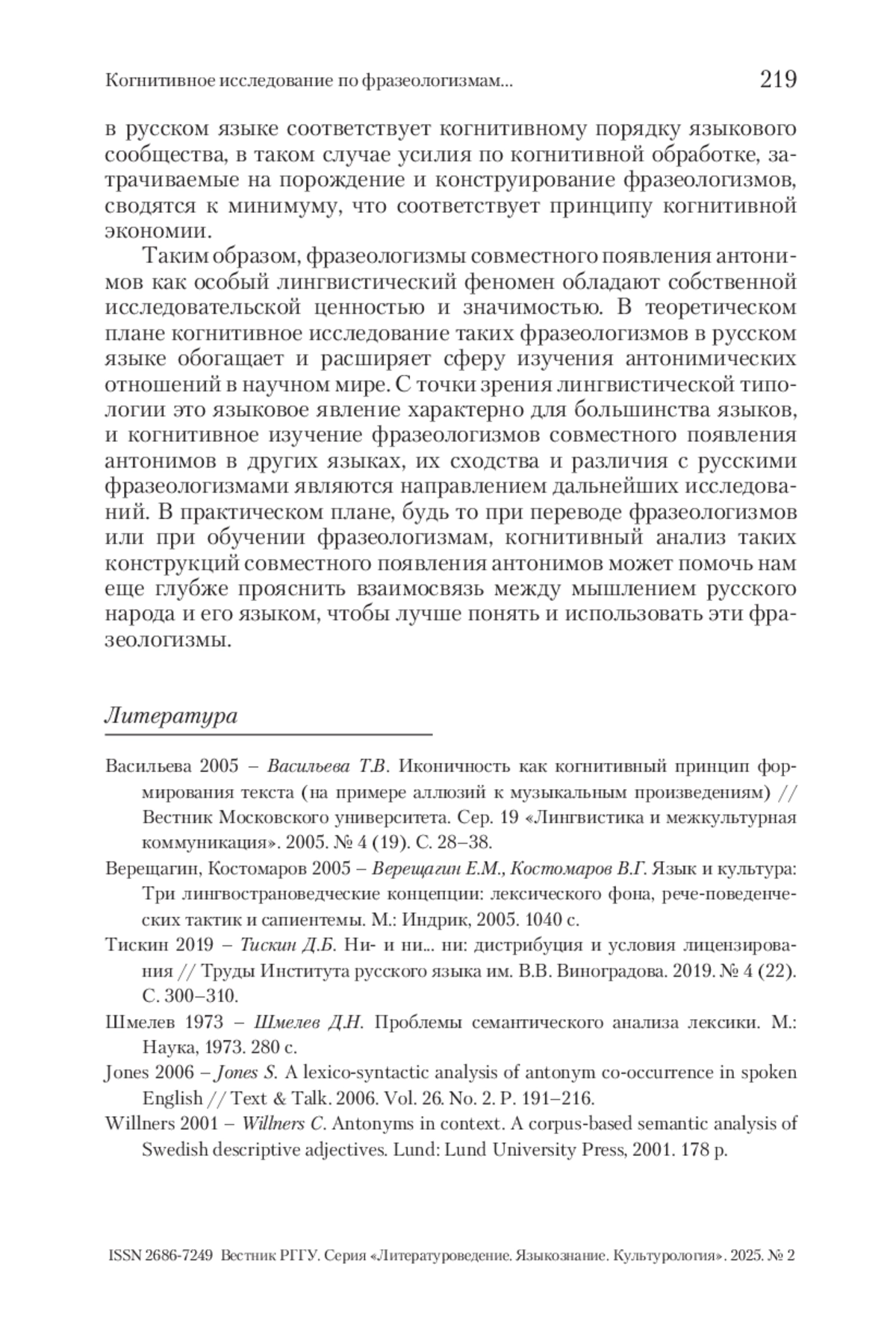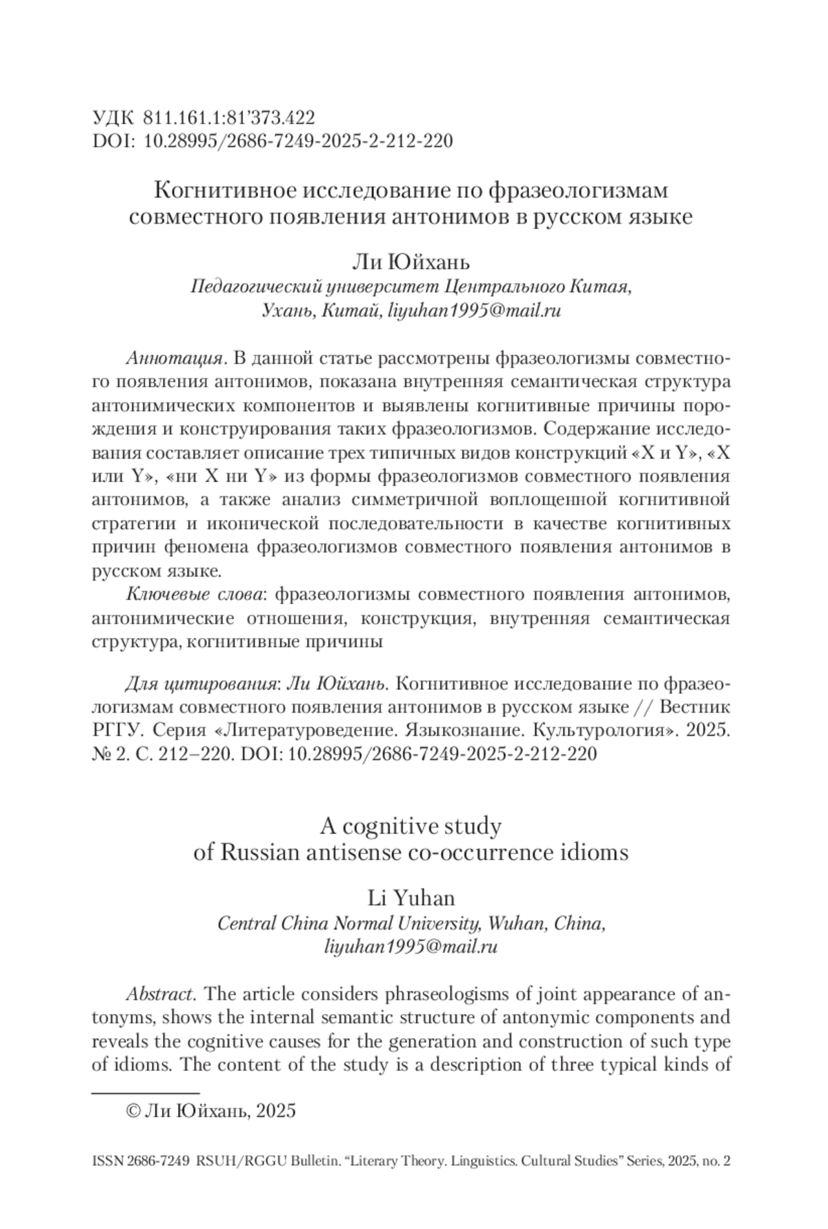 ЛИ Ю. КОГНИТИВНОЕ ИССЛЕДОВАНИЕ ПО ФРАЗЕОЛОГИЗМАМ СОВМЕСТНОГО ПОЯВЛЕНИЯ АНТОНИМОВ В РУССКОМ ЯЗЫКЕ // ВЕСТНИК РГГУ. СЕРИЯ «ЛИТЕРАТУРОВЕДЕНИЕ. ЯЗЫКОЗНАНИЕ. КУЛЬТУРОЛОГИЯ». 2025. № 2