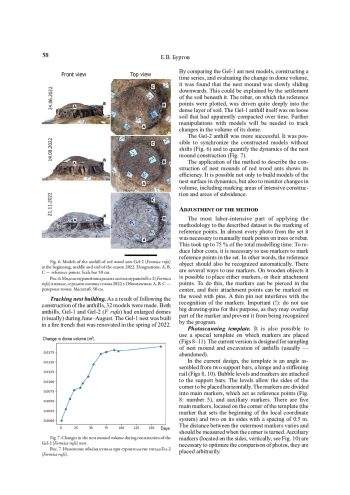 The ant nest is the most important element of a colony’s infrastructure. Anthill construction is one of the most highly organized processes of ant activity. The nests of red wood ants (Formica rufa group) are still insuffi ciently studied in terms of the internal structure of the nest mound made of plant debris, the ratio of materials used by the ants. This is partly due to the nature of the materials — the structure is usually not preserved when the mound material is sampled — and partly to the use of outdated and ineffi cient methods of description. This article discusses the use of photoscanning techniques in the excavation of ant nests and the monitoring of anthill construction. It is shown that photoscanning can be used to track nest construction with assessment of changes in nest mound volume, highlighting areas of intensive construction and subsidence. It is also shown that during the excavation of an anthill, it is possible to estimate the volume of individual parts of the nest mound, including the top layer and inner cone, as well as samples taken from them. Labor costs for fi eld work and data processing were estimated. The most labor-intensive stage of the initial methodology, namely marking reference points on the model, is revealed. Some solutions are proposed to optimize the marking.