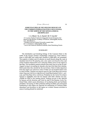 Представлены данные о распространении и биологии размножения гаги обыкновенной на севере архипелага Новая Земля, полученные в результате визуальных наблюдений в 2012–2022 годах и с помощью фотоловушек в 2020–2023 годах. Большинство гаг гнездятся колониями на небольших островах вдоль побережья с плотностью от 0,6 до 50 гнёзд/га; на побережье Северного острова было обнаружено лишь несколько гнёзд (от 0,01 до 0,1 гнёзд/га). Гагары прилетают в регион в конце мая. Инкубационный период длится с начала июня до середины августа из-за того, что самки, потерявшие первую кладку, откладывают яйца повторно. Большинство самцов покидают колонии к концу июня. Сроки отлёта гагар из региона неизвестны; некоторые из них встречаются там даже в середине октября. На кладки охотятся большой поморник ( Stercorarius skua ), сизая чайка ( Larus hyperboreus ), большая чёрная чайка ( L. marinus ) и белый медведь ( Ursus maritimus ). Хищничество песца ( Alopex lagopus ) незначительно, поскольку в период гнездования морские острова с колониями гаг для них недоступны. На успешность гнездования также влияет деятельность человека (туризм и визиты сотрудников национального парка «Русская Арктика»), которая приводит к беспокойству насиживающих птиц и способствует распространению хищников. Для оценки численности и динамики обыкновенной гаги в регионе в целом необходимо обследовать другие потенциальные места гнездования и вести постоянный мониторинг в регионе. Следует ограничить деятельность человека в местах гнездования.