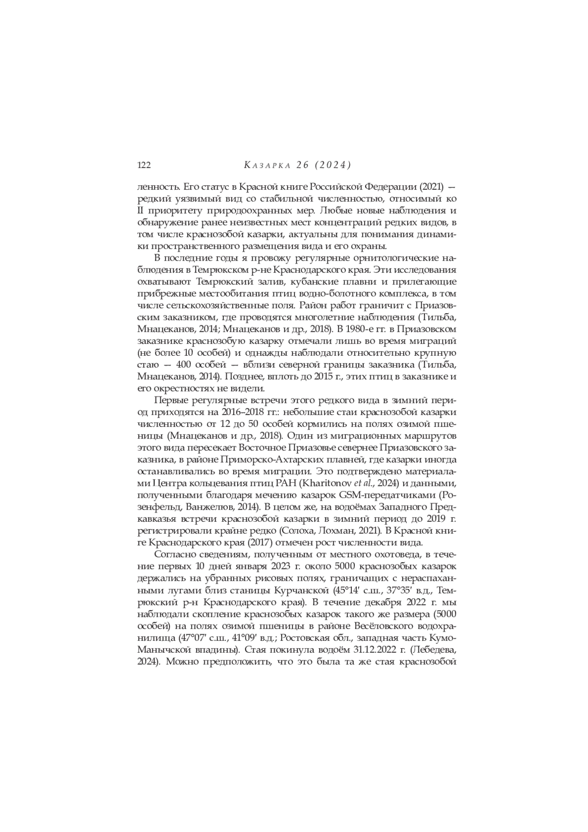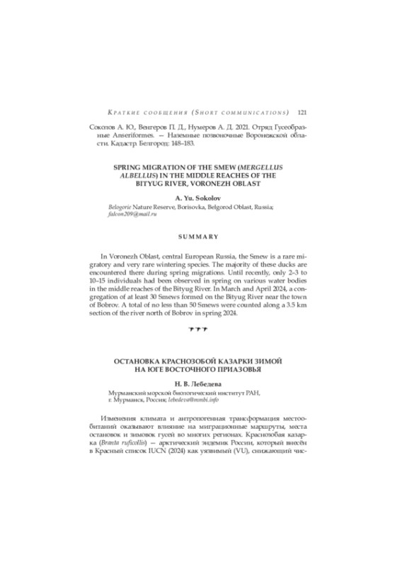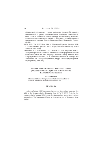 ЛЕБЕДЕВА Н. В. ОСТАНОВКА КРАСНОЗОБОЙ КАЗАРКИ ЗИМОЙ НА ЮГЕ ВОСТОЧНОГО ПРИАЗОВЬЯ // КАЗАРКА: БЮЛЛЕТЕНЬ РАБОЧЕЙ ГРУППЫ ПО ГУСЕОБРАЗНЫМ СЕВЕРНОЙ ЕВРАЗИИ. 2024. № 26