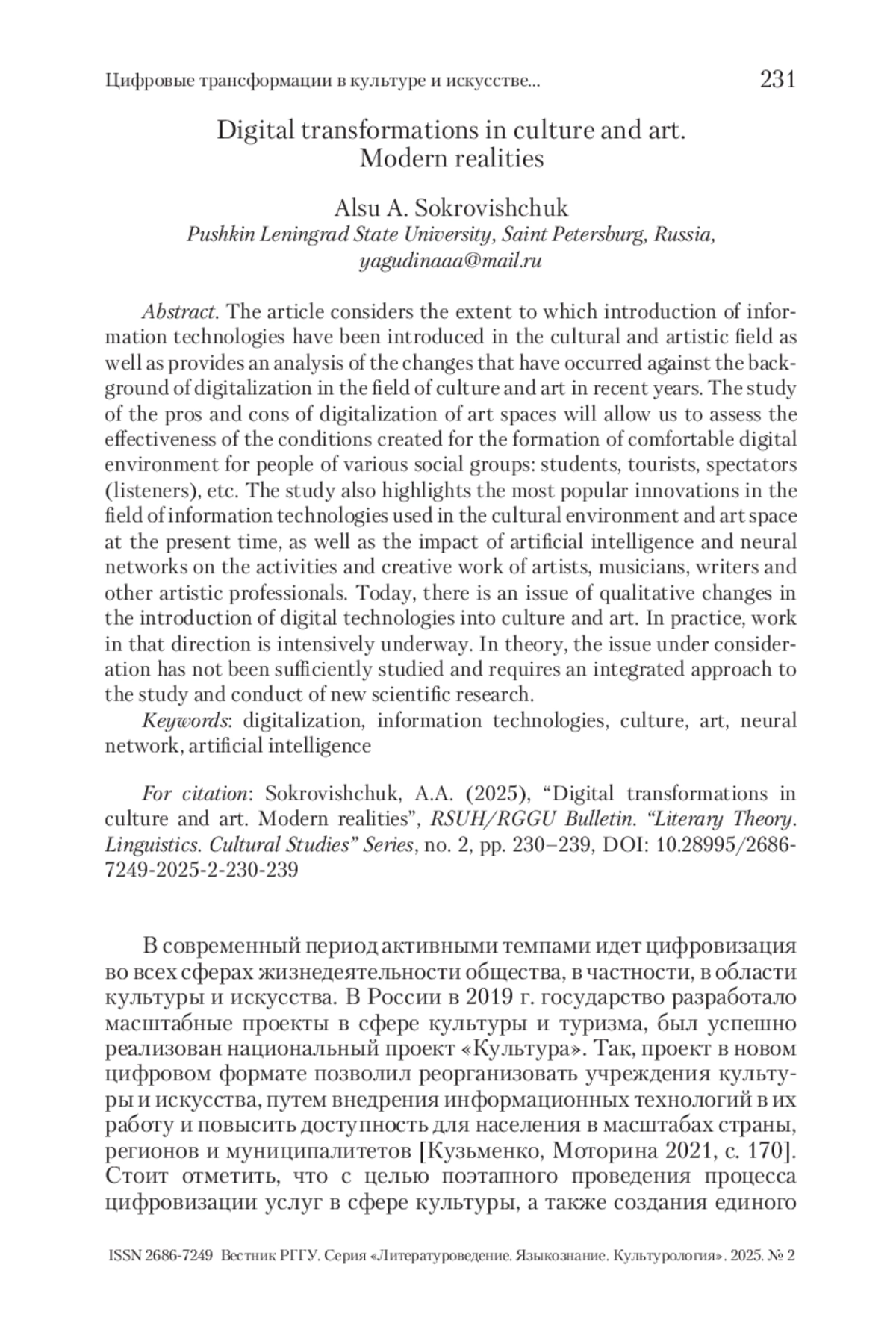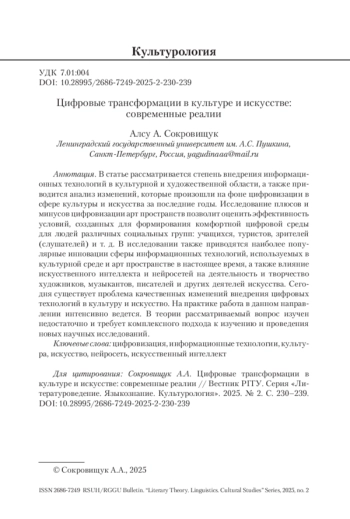 В статье рассматривается степень внедрения информационных технологий в культурной и художественной области, а также приводится анализ изменений, которые произошли на фоне цифровизации в сфере культуры и искусства за последние годы. Исследование плюсов и минусов цифровизации арт пространств позволит оценить эффективность условий, созданных для формирования комфортной цифровой среды для людей различных социальных групп: учащихся, туристов, зрителей (слушателей) и т. д. В исследовании также приводятся наиболее популярные инновации сферы информационных технологий, используемых в культурной среде и арт пространстве в настоящее время, а также влияние искусственного интеллекта и нейросетей на деятельность и творчество художников, музыкантов, писателей и других деятелей искусства. Сегодня существует проблема качественных изменений внедрения цифровых технологий в культуру и искусство. На практике работа в данном направлении интенсивно ведется. В теории рассматриваемый вопрос изучен недостаточно и требует комплексного подхода к изучению и проведения новых научных исследований.