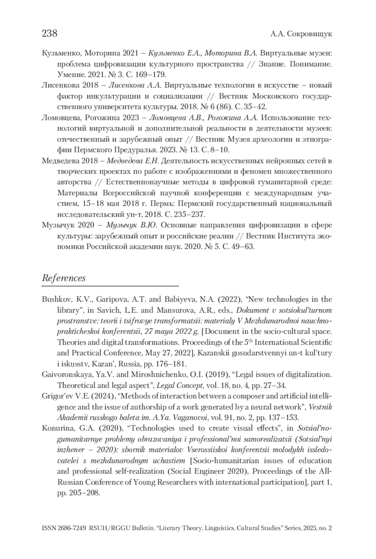 11. Музычук 2020 - Музычук В.Ю. Основные направления цифровизации в сфере культуры: зарубежный опыт и российские реалии // Вестник Института экономики Российской академии наук. 2020. № 5. С. 49-63.