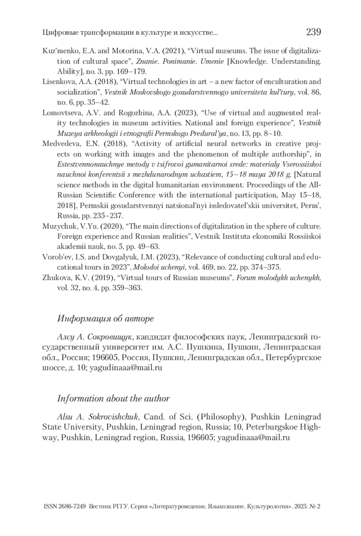 7. Кузьменко, Моторина 2021 - Кузьменко Е.А., Моторина В.А. Виртуальные музеи: проблема цифровизации культурного пространства // Знание. Понимание. Умение. 2021. № 3. С. 169-179.