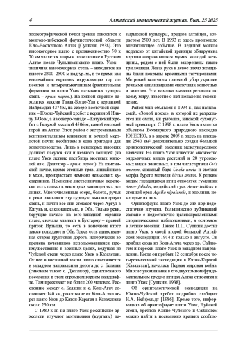 Эта работа – результат орнитологической поездки в 2000 г. по Восточному и Центральному Алтаю, в частности, по восточной окраине плато Укок. Путь в 200 км по долине Тархаты, на плато, по рекам Тара и Елангаш через Южно-Чуйский хребет занял 27 дней. Всего найдено 97 видов птиц, из которых, вероятно, только два не гнездятся в этом районе. Признаки гнездования или пребывания в гнездовой период отмечены для Falco columbarius, Porzana porzana, Asio otus, Anthus godlewskii, Locustella certhiola, Acrocephalus dumetorum и Hippolais caligata. Семь видов из Красной книги Республики Алтай: Gavia arctica, Ciconia nigra, Cygnus cygnus, Buteo hemilasius, Aquila chrysaetos, Grus virgo и Leucosticte brandti. Многие виды можно было наблюдать здесь на верхней границе их распространения на Алтае, а также на южной или северной окраине их гнездового ареала. Представлены сонограммы пения и позывок Locustella certhiola, Hippolais caligata, Uragus sibiricus и Leucosticte arctoa.