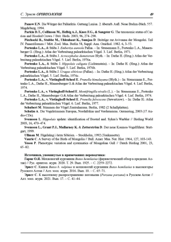 105. Piechocki R., Stubbe M., Uhlenhaut K., Sumjaa D. Beitrage zur Avivauna der Mongolei. Teil IV. Passeriformes // Mitt. Zool. Mus. Berlin 58, Suppl: Ann. Ornithol. 1982. 6, 3-53.