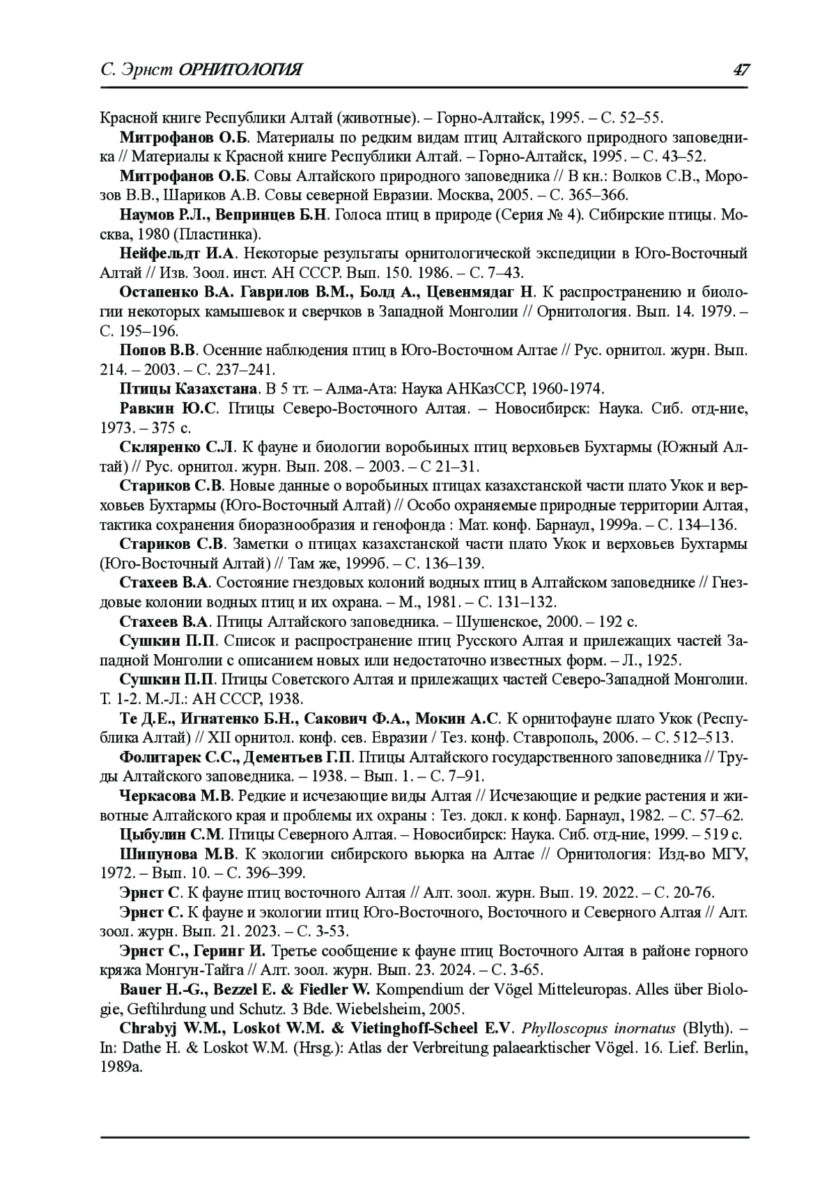 72. Эрнст С. К фауне и экологии птиц Юго-Восточного, Восточного и Северного Алтая // Алт. зоол. журн. Вып. 21. 2023. - С. 3-53.