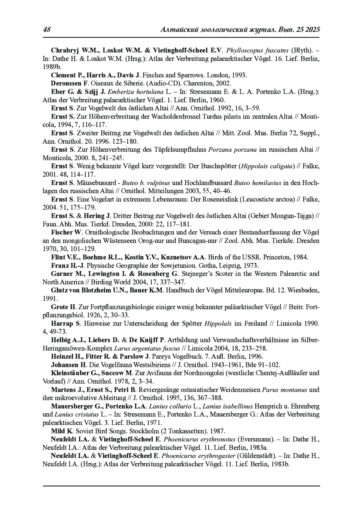 86. Ernst S. & Hering J. Dritter Beitrag zur Vogelwelt des ostlichen Altai (Gebiet Mongun-Tajga) // Faun. Abh. Mus. Tierkd. Dresden, 2000: 22, 117-181.