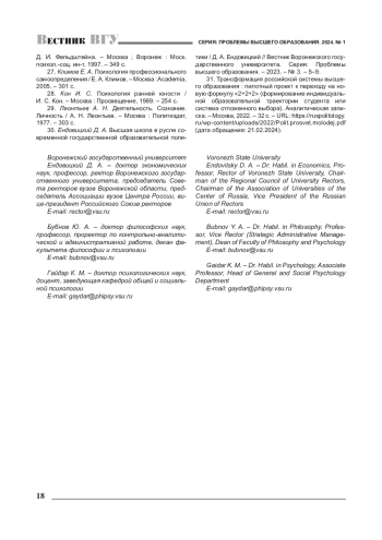 30. Ендовицкий Д. А. Высшая школа в русле современной государственной образовательной политики / Д. А. Ендовицкий // Вестник Воронежского государственного университета. Серия: Проблемы высшего образования. - 2023. - № 3. - 5-9. EDN: RBXVSG