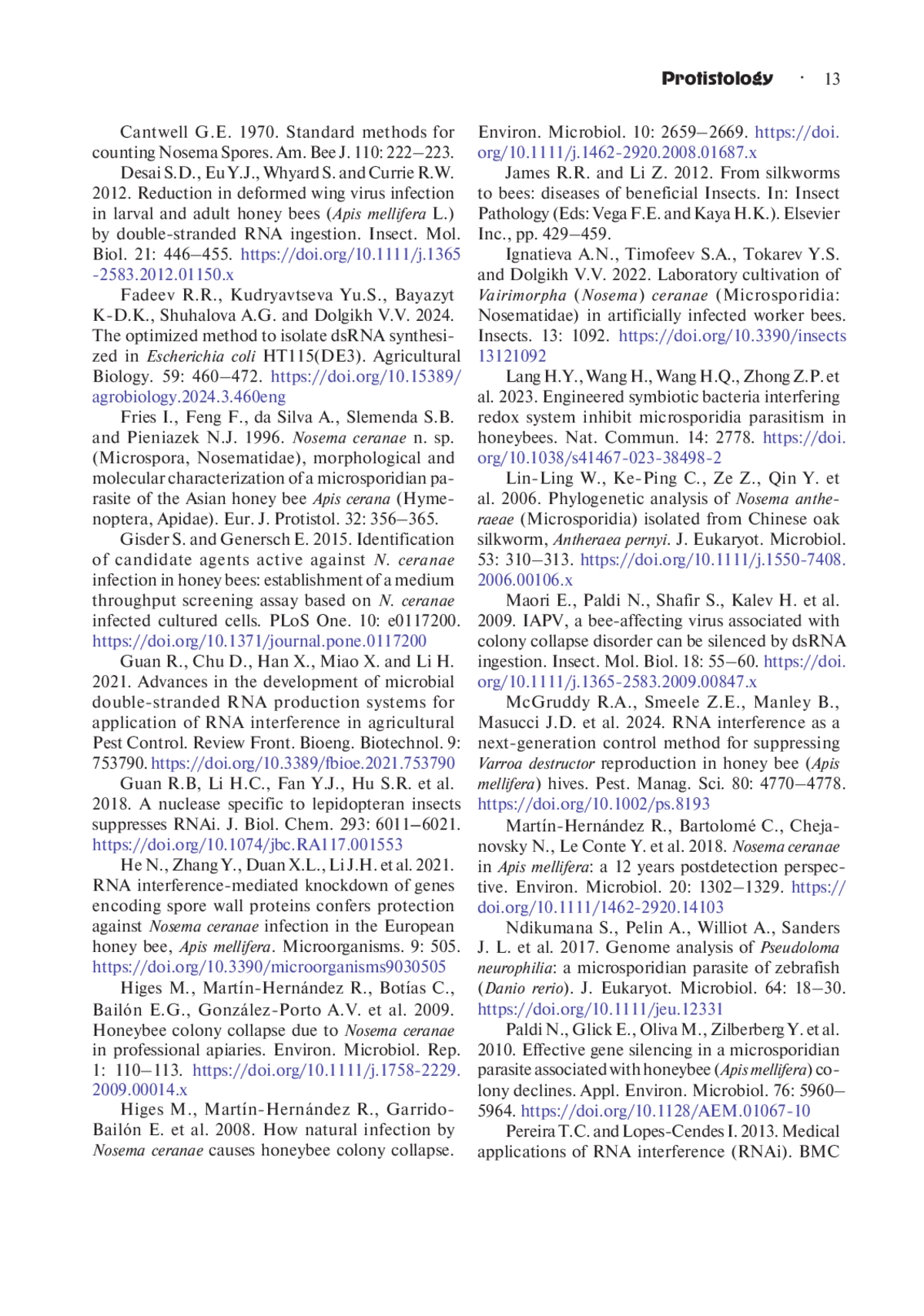 12. He N., Zhang Y., Duan X.L., Li J.H. et al. 2021. RNA interference-mediated knockdown of genes encoding spore wall proteins confers protection against Nosema ceranae infection in the European honey bee, Apis mellifera. Microorganisms. 9: 505. DOI: 10.3390/microorganisms9030505 EDN: CYZPFJ