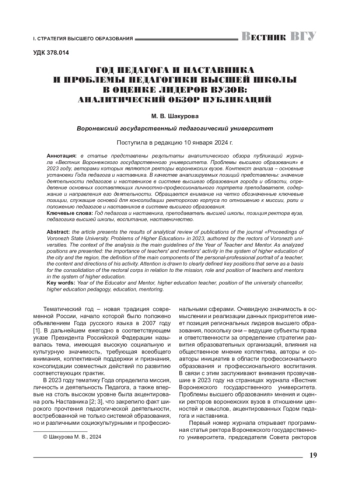 В статье представлены результаты аналитического обзора публикаций журнала «Вестник Воронежского государственного университета. Проблемы высшего образования» в 2023 году, авторами которых являются ректоры воронежских вузов. Контекст анализа - основные установки Года педагога и наставника. В качестве анализируемых позиций представлены: значение деятельности педагогов и наставников в системе высшего образования города и области, определение основных составляющих личностно-профессионального портрета преподавателя, содержание и направления его деятельности. Обращается внимание на четко обозначенные ключевые позиции, служащие основой для консолидации ректорского корпуса по отношению к миссии, роли и положению педагогов и наставников в системе высшего образования.