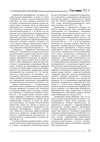 Приоритетом в современных условиях становится систематизация опыта наставничества, использования его многомерного потенциала. Взаимосвязь научно-педагогического опыта и наставничества проявляется, прежде всего, в деятельности научно-педагогических школ [4, с. 6], просветительских и научно-популяризаторских практиках [Там же, с. 8; 5, с. 5]. В Год педагога и наставника на страницах журнала «Вестник Воронежского государственного университета. Проблемы высшего образования» в каждом номере публиковались статьи об университетских педагогах-ученых, наполненные как воспоминаниями об их жизни и деятельности, используемых методиках преподавания, работы со студенческой молодежью, так и словами признательности наставникам, сыгравшим значимую роль в личностно-профессиональном становлении современных преподавателей и составляющим гордость воронежской науки и воронежской высшей школы.