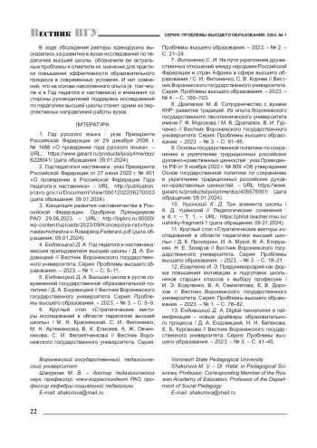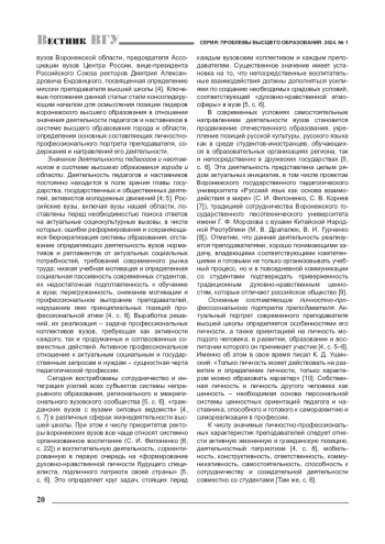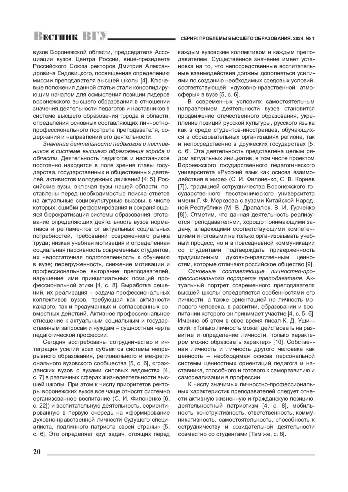 4. Ендовицкий Д. А. Год педагога и наставника: миссия преподавателя высшей школы / Д. А. Ендовицкий // Вестник Воронежского государственного университета. Серия: Проблемы высшего образования. - 2023. - № 1. - С. 5-11. EDN: UGLNXD