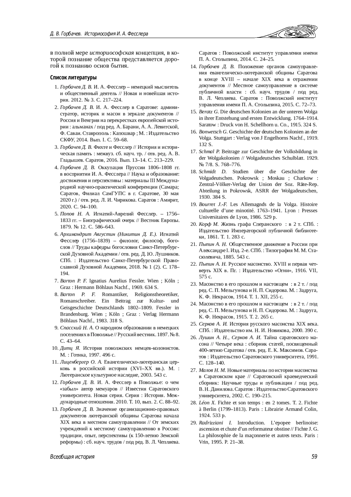 3. Горбачев Д. В. Фихте и Фесслер // История и историческая память: межвуз. сб. науч. тр. / отв. ред. А. В. Гладышев. Саратов, 2016. Вып. 13-14. С. 213-229.