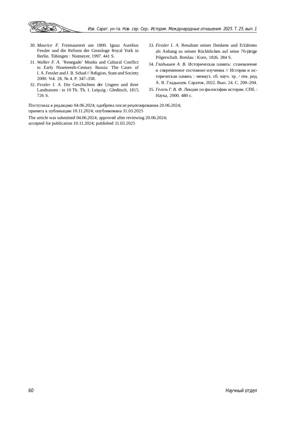 12. Горбачев Д. В. И. А. Фесслер в Поволжье: о чем “забыл” автор мемуаров // Известия Саратовского университета. Новая серия. Серия: История. Международные отношения. 2010. Т. 10, вып. 2. С. 88-92. EDN: NHSSLR