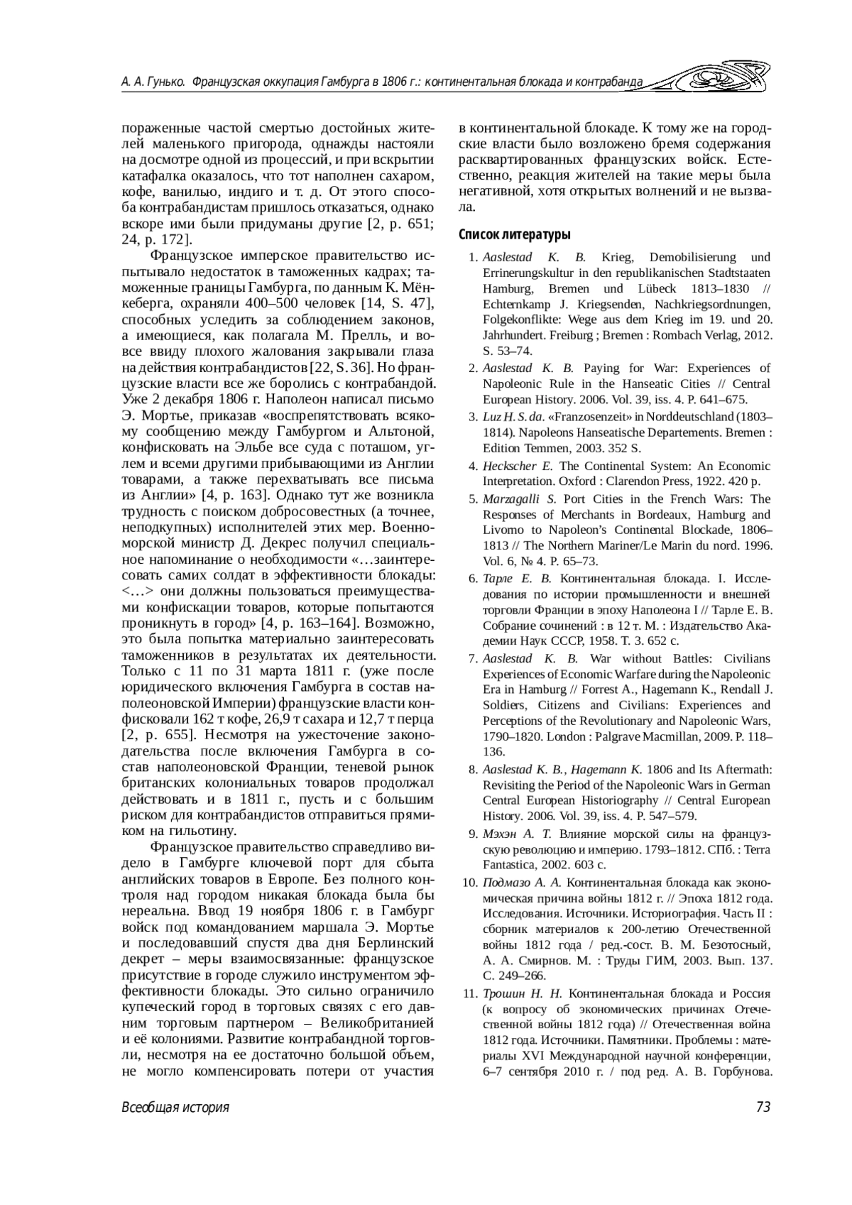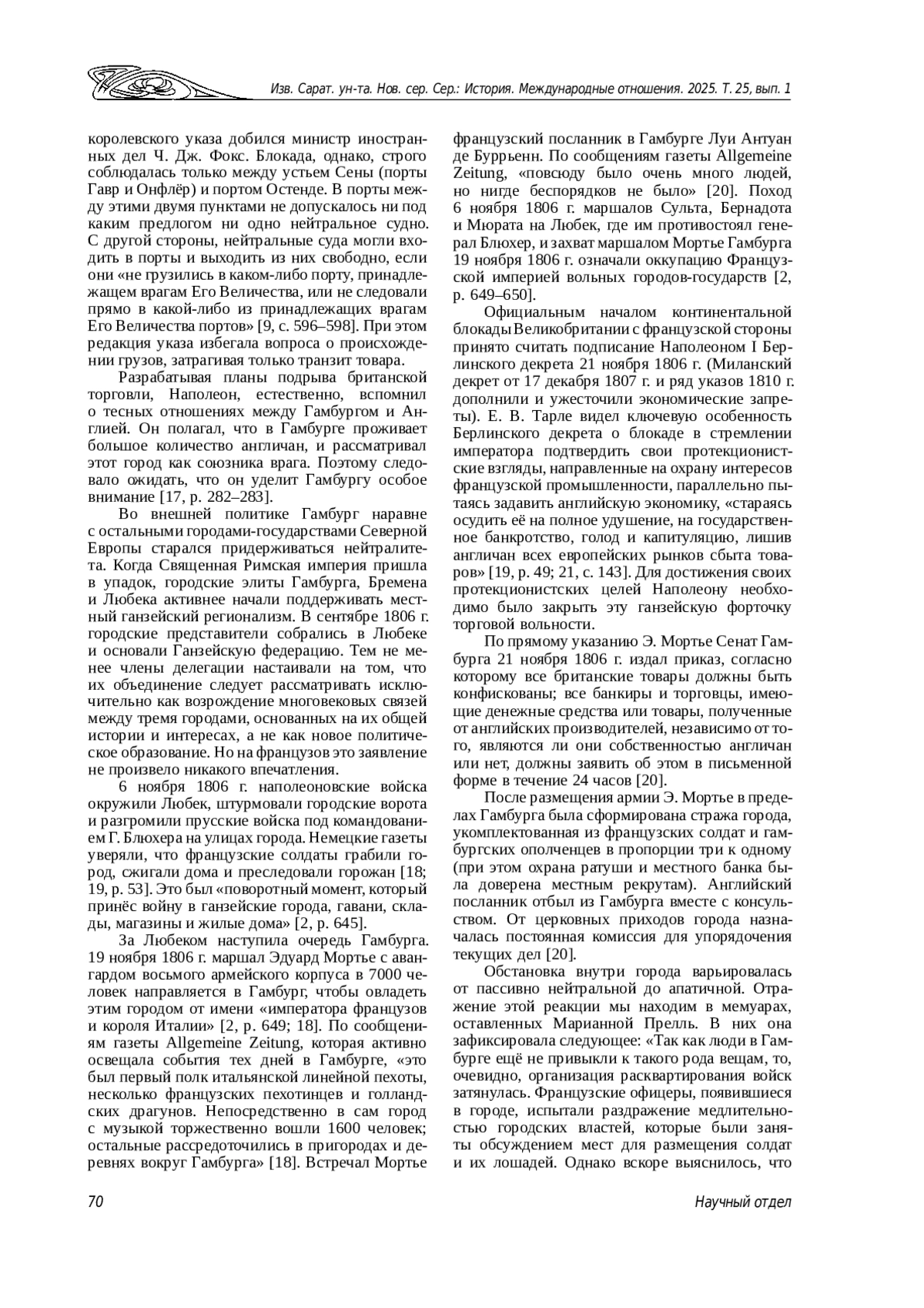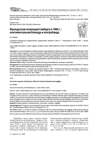 ГУНЬКО А. А. ФРАНЦУЗСКАЯ ОККУПАЦИЯ ГАМБУРГА В 1806 Г.: КОНТИНЕНТАЛЬНАЯ БЛОКАДА И КОНТРАБАНДА // ИЗВЕСТИЯ САРАТОВСКОГО УНИВЕРСИТЕТА. НОВАЯ СЕРИЯ. СЕРИЯ: ИСТОРИЯ. МЕЖДУНАРОДНЫЕ ОТНОШЕНИЯ. 2025. Т. 25 № 1