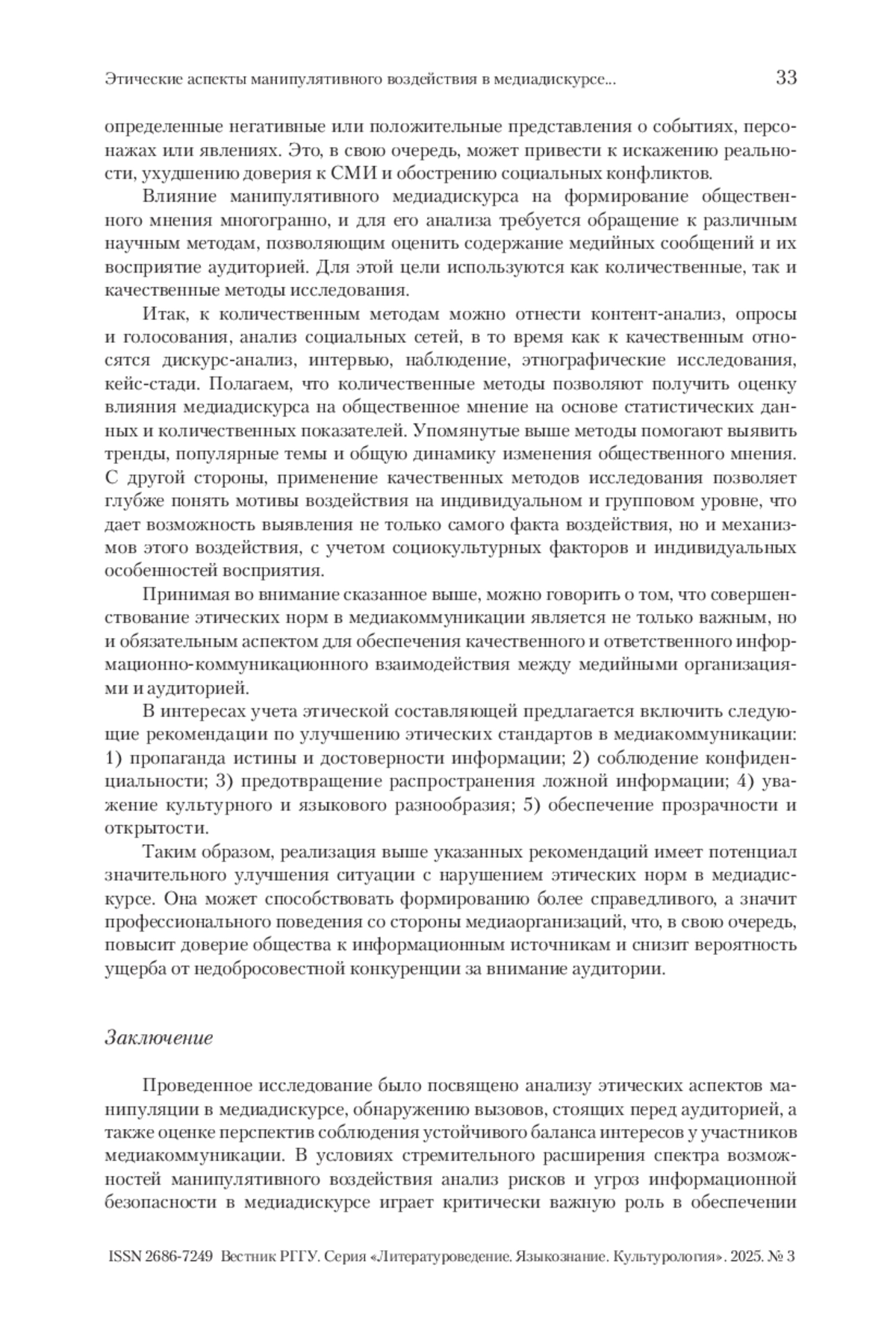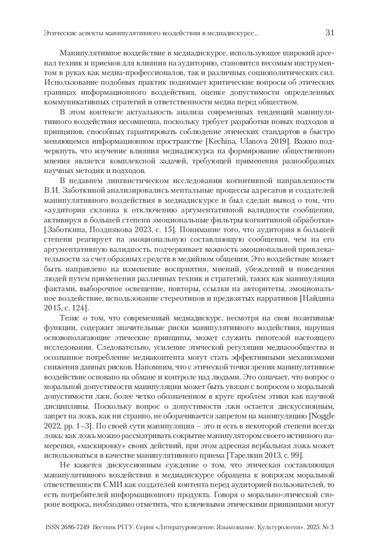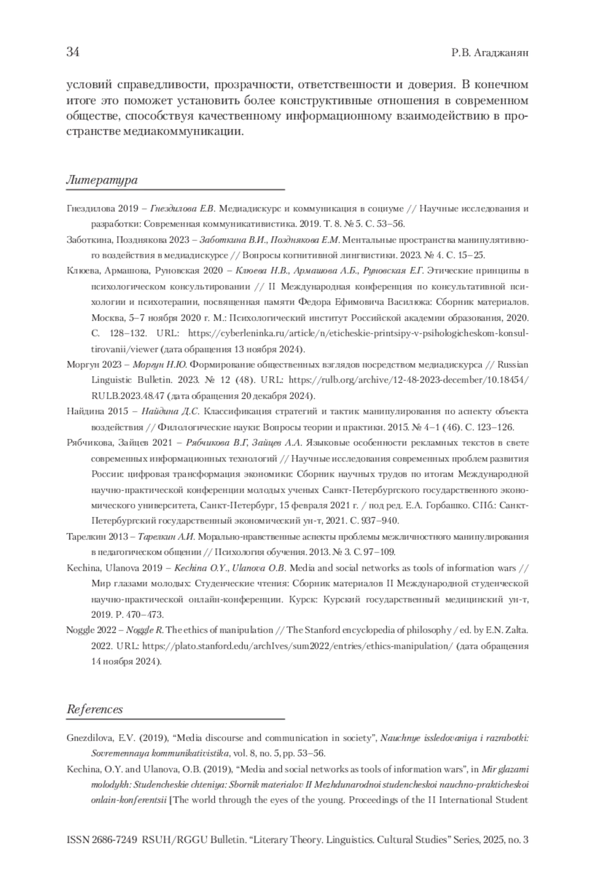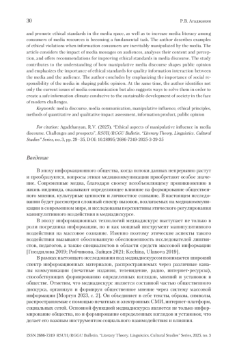 АГАДЖАНЯН Р. В. ЭТИЧЕСКИЕ АСПЕКТЫ МАНИПУЛЯТИВНОГО ВОЗДЕЙСТВИЯ В МЕДИАДИСКУРСЕ: ВЫЗОВЫ И ПЕРСПЕКТИВЫ // ВЕСТНИК РГГУ. СЕРИЯ «ЛИТЕРАТУРОВЕДЕНИЕ. ЯЗЫКОЗНАНИЕ. КУЛЬТУРОЛОГИЯ». 2025. № 3