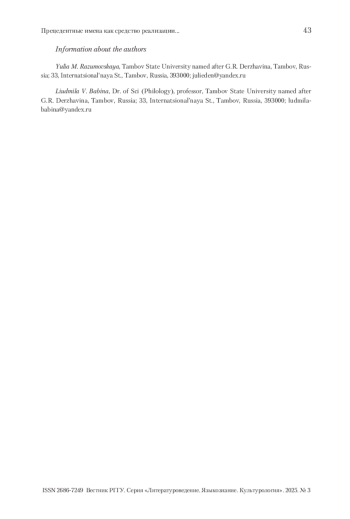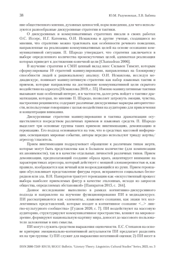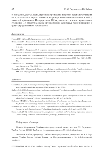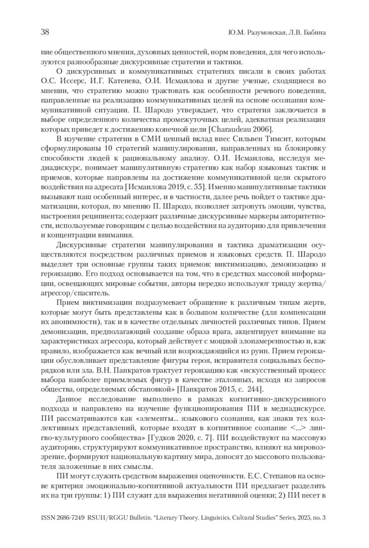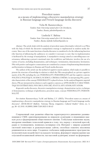 РАЗУМОВСКАЯ Ю. М., БАБИНА Л. В. ПРЕЦЕДЕНТНЫЕ ИМЕНА КАК СРЕДСТВО РЕАЛИЗАЦИИ ДИСКУРСИВНОЙ СТРАТЕГИИ МАНИПУЛИРОВАНИЯ В РУССКОМ И ФРАНЦУЗСКОМ МЕДИАДИСКУРСЕ // ВЕСТНИК РГГУ. СЕРИЯ «ЛИТЕРАТУРОВЕДЕНИЕ. ЯЗЫКОЗНАНИЕ. КУЛЬТУРОЛОГИЯ». 2025. № 3