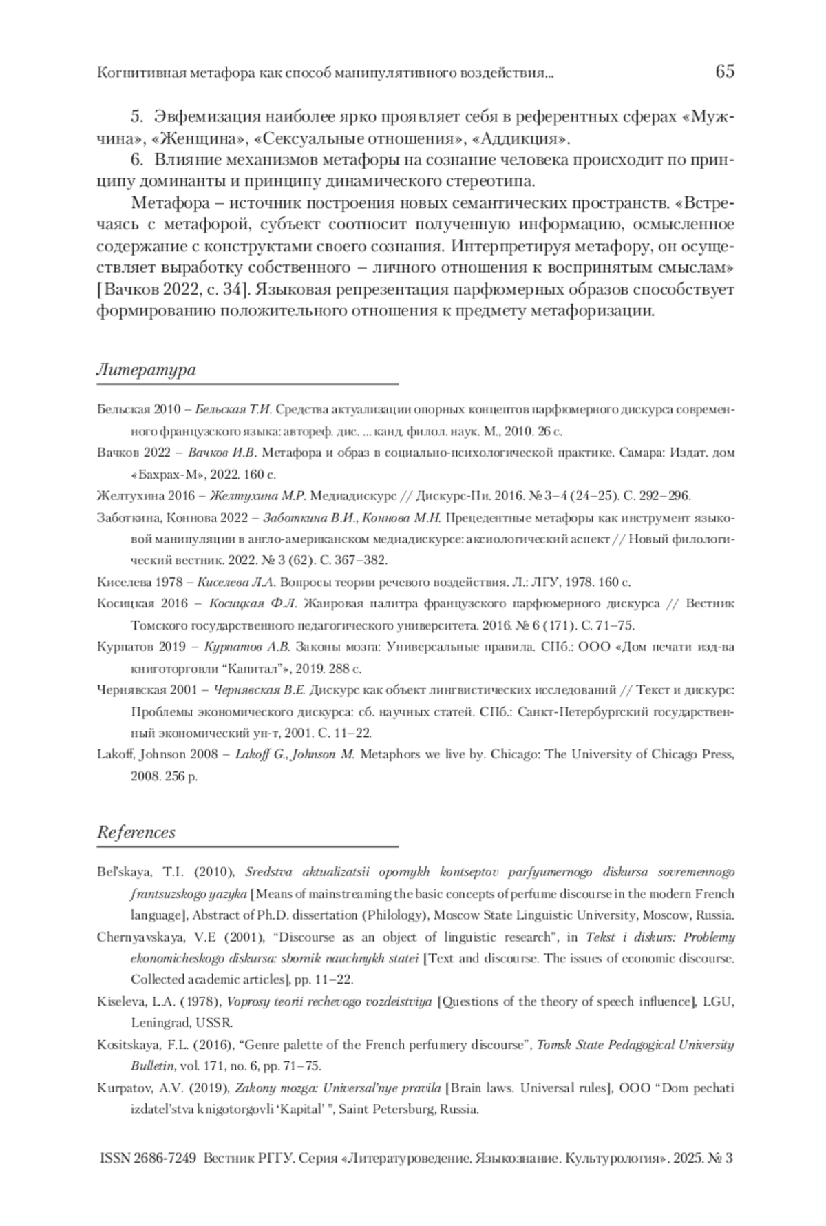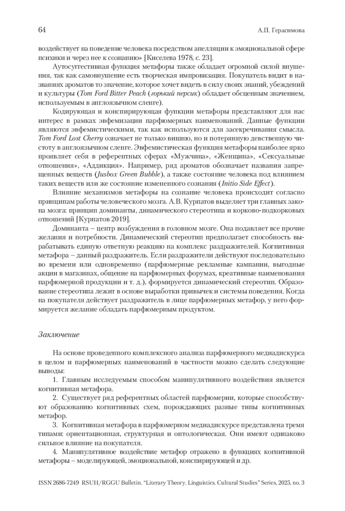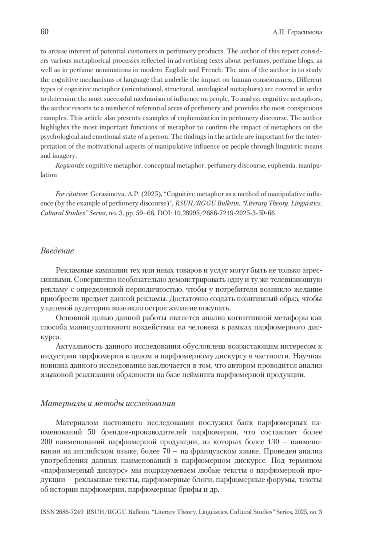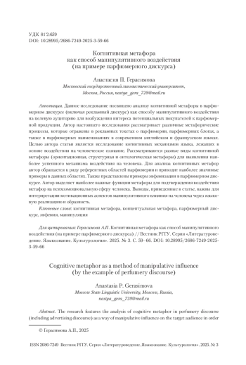 ГЕРАСИМОВА А. П. КОГНИТИВНАЯ МЕТАФОРА КАК СПОСОБ МАНИПУЛЯТИВНОГО ВОЗДЕЙСТВИЯ (НА ПРИМЕРЕ ПАРФЮМЕРНОГО ДИСКУРСА) // ВЕСТНИК РГГУ. СЕРИЯ «ЛИТЕРАТУРОВЕДЕНИЕ. ЯЗЫКОЗНАНИЕ. КУЛЬТУРОЛОГИЯ». 2025. № 3