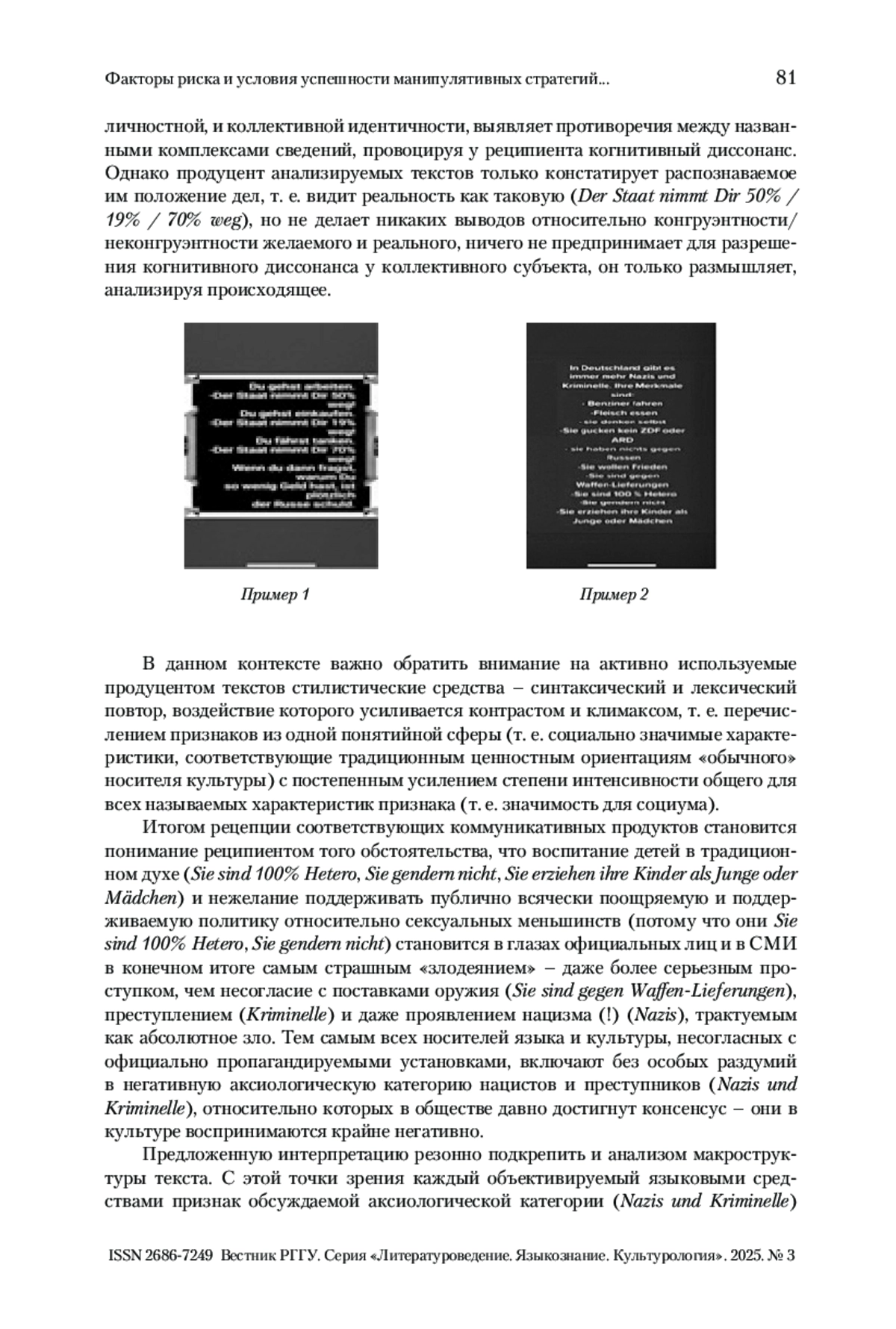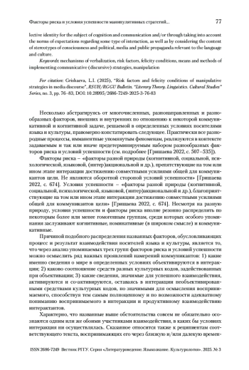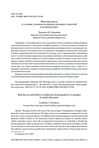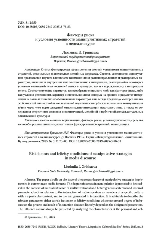 Статья фокусируется на осмыслении степени успешности манипулятивных стратегий, реализуемых в актуальных медийных форматах. Степень успешности манипуляции предлагается изучать в контексте взаимовлияния разнонаправленных и разнородных параметров, внешних и внутренних как по отношению к интеракции, реализуемой в некоторых условиях взаимодействия носителей языка и культуры, так и к порождаемому в интеракции тексту. Соответствующие параметры целесообразно описывать либо как факторы риска, либо как условия успешности, характер и степень влияния которых на процесс и результат интеракции не зависят линейно от обозначенных параметров и не всегда предсказуемы через анализ особенностей личностной и коллективной идентичности субъекта познания и коммуникации и/или через учет норм ожиданий относительно интеракции некоторого типа, а также от содержания стереотипов сознания и политической, медийной и публичной агенды, актуальных для языковой культуры.