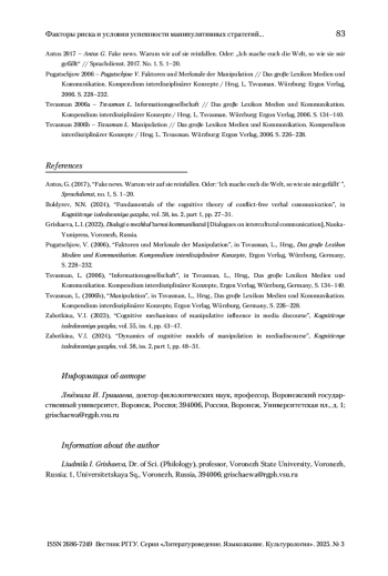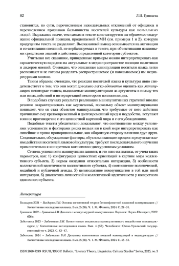 3. Заботкина 2023 - Заботкина В.И. Когнитивные механизмы манипулятивного воздействия в медиадискурсе // Когнитивные исследования языка. Вып. 4 (55). Челябинск: Южно-Уральский государственный ун-т, 2023. С. 43-47.