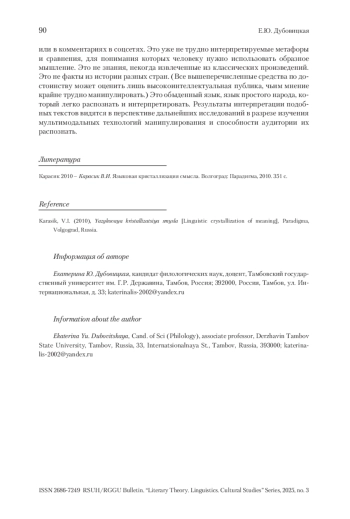Данное исследование рассматривает дисфемизацию эвфемистических единиц как средство манипулирования общественным сознанием. Целью исследования является выявление факторов, влияющих на изменение коннотации эвфемистических единиц в дискурсе социальных сетей. В ходе исследования выдвинута гипотеза о триггерах (предпосылках) превращения эвфемизма в дисфемизм. Удалось выделить три самых продуктивных дискурсивных механизма формирования семантики амбивалентных эвфемистических единиц, а именно: 1) реализацию метафорических и метонимических концептуальных моделей; 2) нивелирование эвфемистического эффекта путем экспликации или использования синонима; 3) использование языковых единиц, характеризующихся амбивалентной коннотацией наряду с эвфемизмом. В процессе исследования были также описаны пять концептуальных моделей формирования фонда дисфемистических единиц в дискурсе социальных сетей. Сделан вывод о роли дисфемизации в процессе манипуляции общественным сознанием. На основе полученных результатов можно рассматривать дисфемизацию эвфемистических единиц как эффективный инструмент воздействия на общественное сознание и формирования определенного мнения о событиях или явлениях. Данное исследование позволяет более глубоко понять процессы манипуляции языком и выявить механизмы, с помощью которых происходит изменение коннотации слов и выражений в дискурсе социальных сетей.
