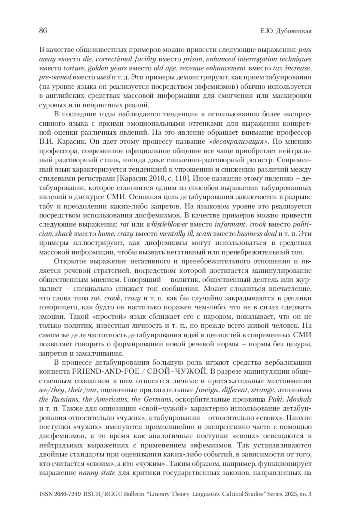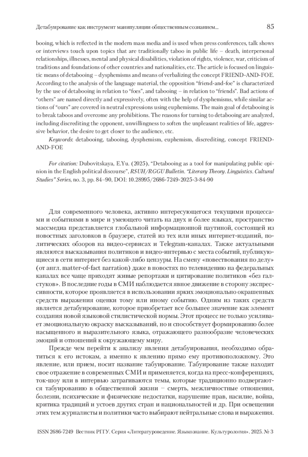 В статье рассматриваются примеры языкового детабуирования, применяемого в современных англоязычных массмедиа в целях манипуляции общественным сознанием. Раскрывается понятие табуирования, которое находит свое отражение в современных СМИ и применяется, когда на пресс-конференциях, ток-шоу или в интервью затрагиваются темы, которые традиционно подвергаются табуированию в общественной жизни – смерть, межличностные отношения, болезни, психические и физические недостатки, нарушение прав, насилие, война, критика традиций и устоев других стран и национальностей и др. Рассматриваются языковые средства детабуирования – дисфемизмы и средства вербализации концепта FRIEND-AND-FOE/СВОЙ–ЧУЖОЙ. Согласно анализу языкового материала, для оппозиции «свой-чужой» характерно использование детабуирования относительно «чужих», а табуирования – относительно «своих». Плохие поступки «чужих» именуются прямолинейно и экспрессивно часто с помощью дисфемизмов, в то время как аналогичные поступки «своих» освещаются в нейтральных выражениях с применением эвфемизмов. Основная цель детабуирования заключается в разрыве табу и преодолении каких-либо запретов. Анализируются причины обращения к детабуированию, среди которых дискредитация противника, нежелание смягчать неприятные реалии жизни, агрессивное поведение, желание сблизиться с аудиторией и др.