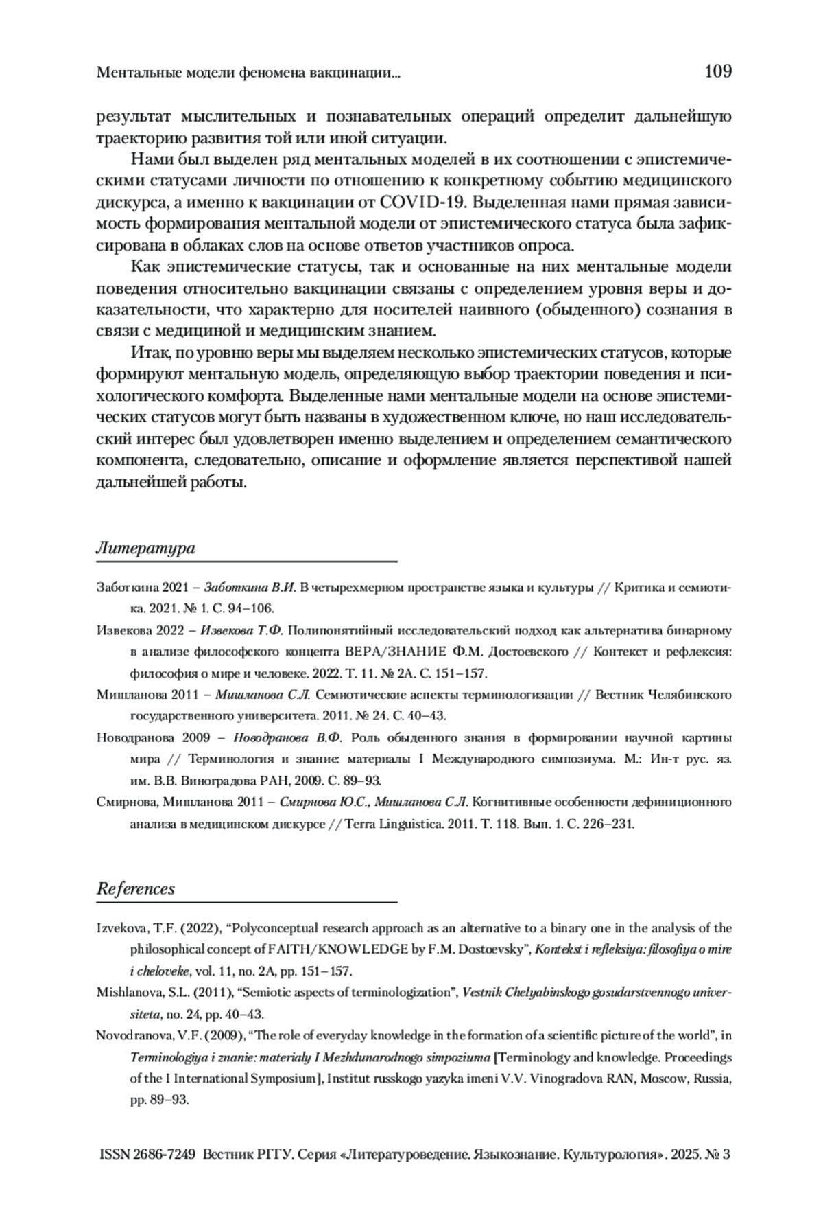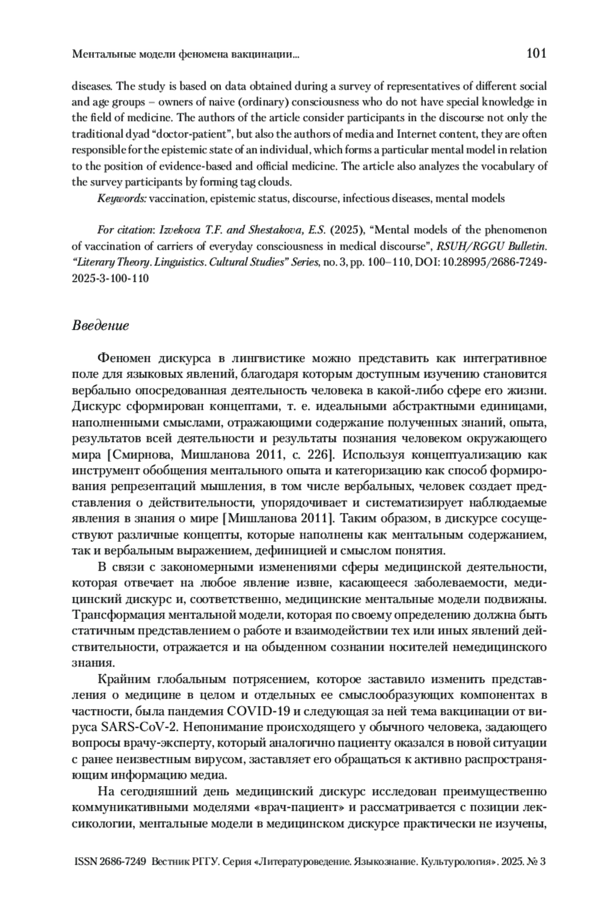 Статья посвящена анализу ментальных моделей, формирующихся в свою очередь на базе определенных эпистемических статусов у людей, принимающих решение о вакцинации от инфекционных болезней. Исследование строится на данных, полученных в ходе опроса представителей разных социальных и возрастных групп – обладателей наивного (обыденного) сознания, не имеющих специальных познаний в области медицины. Участниками дискурса авторы статьи считают не только традиционную диаду «врач-пациент», а также и авторов медиа и интернет контента, зачастую именно они являются ответственными за эпистемическое состояние индивида, которое формирует ту или иную ментальную модель по отношению к позиции доказательной и официальной медицине. В статье также производится анализ лексики участников опроса путем формирования облаков тегов.