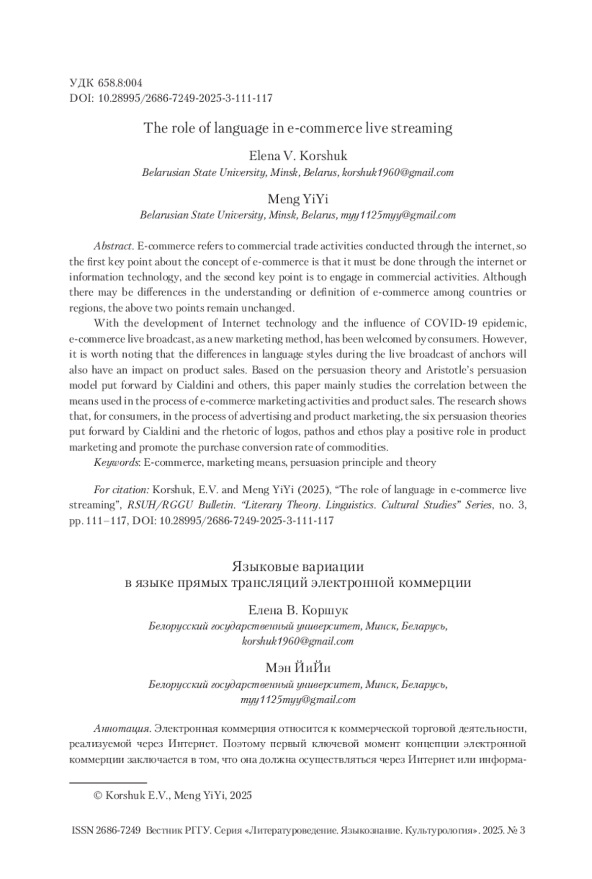 1. Chen, Bai, Jing 2023 - Chen D., Bai K., Jing C. The influence of language style on sales effect in e-commerce live broadcast-based on SVM model // Science and Technology for Development. 2023. Vol. 19. No. 3. P. 149-161.