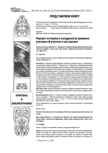 В рецензии охарактеризованы основные положения второго, исправленного и дополненного издания книги П. С. Кабытова и Н. А. Фёдоровой, посвященной описанию жизни и научного творчества профессора И. М. Ионенко. Авторы рецензируемой книги, в прошлом студенты и аспиранты И. М. Ионенко, рассказывают о его жизненном пути, становлении как историка и преподавателя вуза, его научных достижениях и общественной деятельности. Личность Учителя и наставника, стремившегося научить своих учеников профессиональному подходу к изучению исторической правды, раскрывается в контексте времени, в котором он жил и работал, подчеркивается, что при подготовке молодых кадров историков важно не только вооружить их инструментарием исторического исследования, но и наладить духовную связь между наставником и его учениками. Авторы сумели передать обаяние личности своего Учителя, научившего их не только добывать информацию, но и располагать ее в системе нравственных координат. В заключение сделан вывод, что выпуск второго издания книги свидетельствует о ее востребованности.