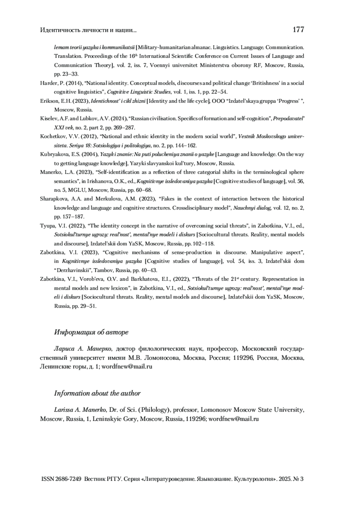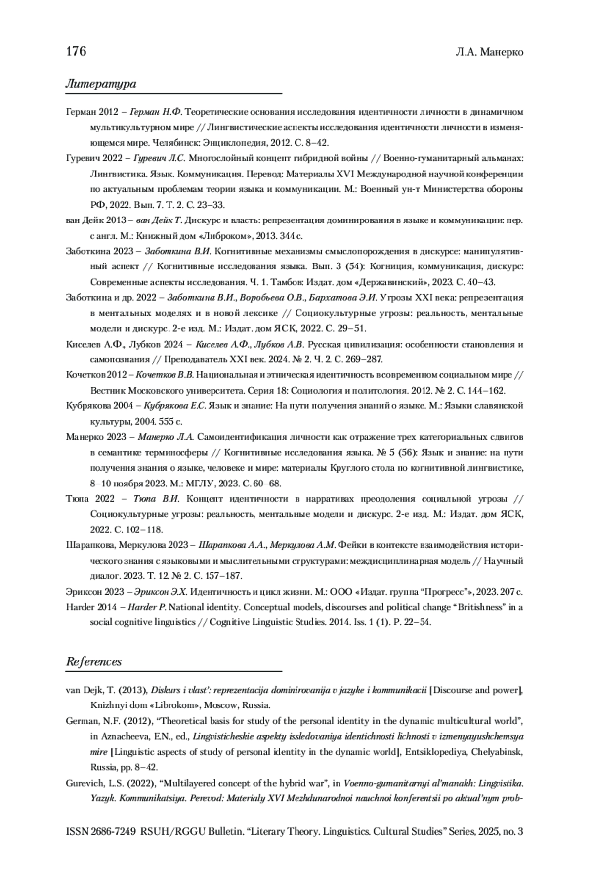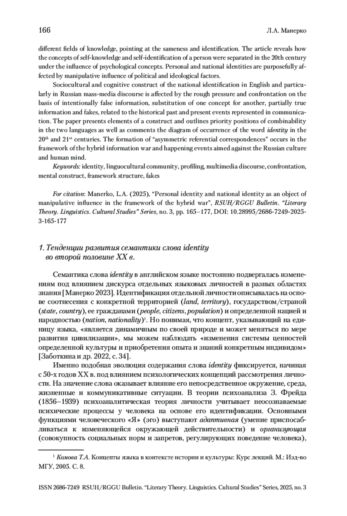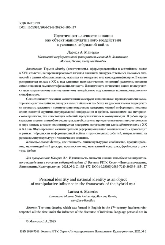 МАНЕРКО Л. А. ИДЕНТИЧНОСТЬ ЛИЧНОСТИ И НАЦИИ КАК ОБЪЕКТ МАНИПУЛЯТИВНОГО ВОЗДЕЙСТВИЯ В УСЛОВИЯХ ГИБРИДНОЙ ВОЙНЫ // ВЕСТНИК РГГУ. СЕРИЯ «ЛИТЕРАТУРОВЕДЕНИЕ. ЯЗЫКОЗНАНИЕ. КУЛЬТУРОЛОГИЯ». 2025. № 3
