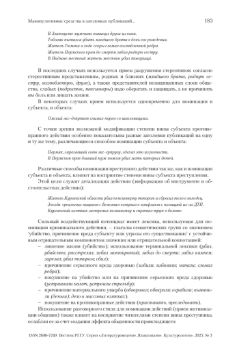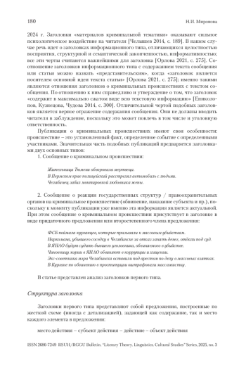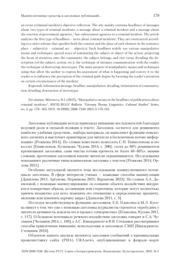 МИРОНОВА Н. И. МАНИПУЛЯТИВНЫЕ СРЕДСТВА В ЗАГОЛОВКАХ ПУБЛИКАЦИЙ О КРИМИНАЛЬНЫХ ПРОИСШЕСТВИЯХ // ВЕСТНИК РГГУ. СЕРИЯ «ЛИТЕРАТУРОВЕДЕНИЕ. ЯЗЫКОЗНАНИЕ. КУЛЬТУРОЛОГИЯ». 2025. № 3