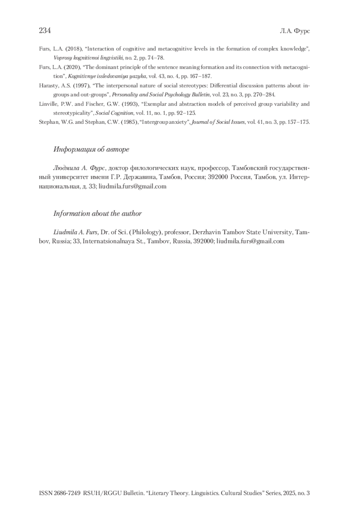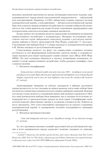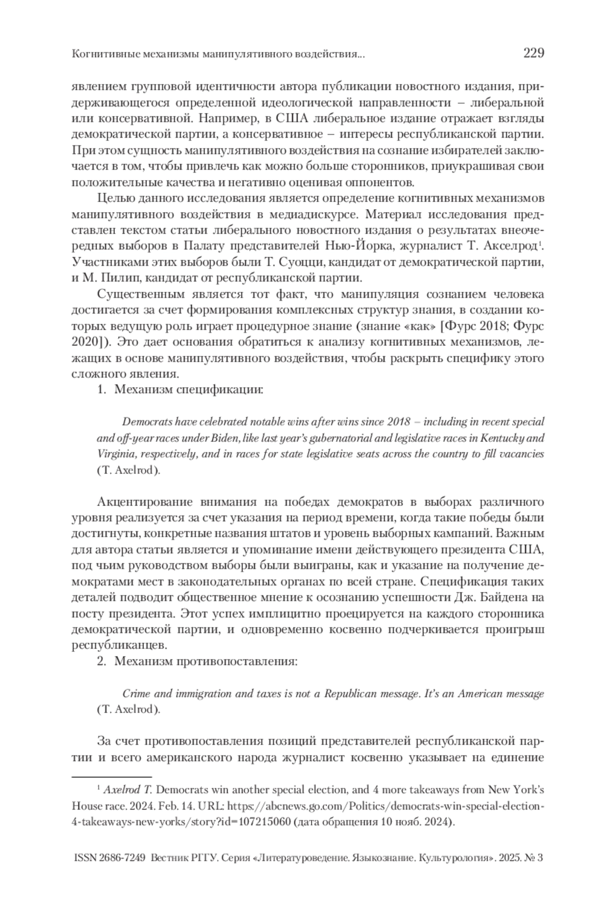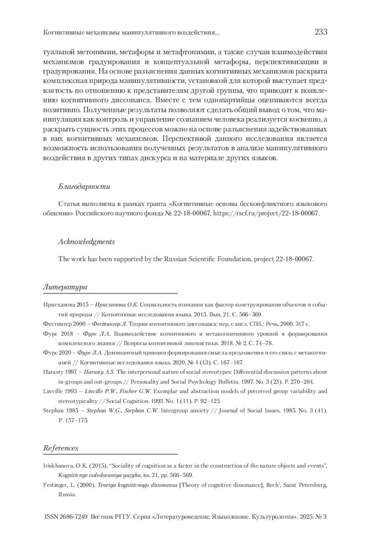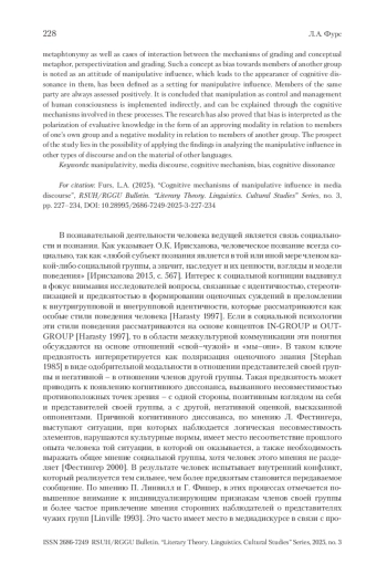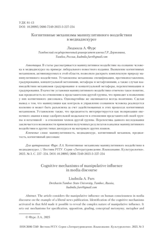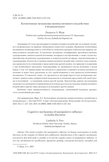 ФУРС Л. А. КОГНИТИВНЫЕ МЕХАНИЗМЫ МАНИПУЛЯТИВНОГО ВОЗДЕЙСТВИЯ В МЕДИАДИСКУРСЕ // ВЕСТНИК РГГУ. СЕРИЯ «ЛИТЕРАТУРОВЕДЕНИЕ. ЯЗЫКОЗНАНИЕ. КУЛЬТУРОЛОГИЯ». 2025. № 3