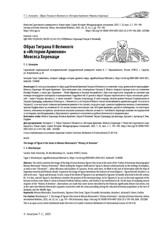 В статье рассматривается образ царя Великой Армении Тиграна II Великого в сочинении «отца армянской историографии» Мовсеса Хоренаци «История Армении». При написании глав, посвященных Тиграну II, Мовсес опирался прежде всего на сочинения Иосифа Флавия, а также две «Хроники» – Юлия Африкана и Евсевия Кесарийского. При этом недостаток сведений он заполнял при помощи легендарного материала и вымышленных подробностей. В целом в образе Тиграна переплетаются черты нескольких деятелей – самого Тиграна, Арташеса I, а также сыновей – Тиграна и Артавазда. В свою очередь, многие деяния Тиграна II приписываются Тиграну I Ервандиду, жившему в VI веке до н. э. Именно его, а не Тиграна II Мовсес считает величайшим из армянских царей. Что касается Тиграна II, то он выступает главным противником римлян в тех случаях, когда речь идет о римско-парфянских военных столкновениях, причем Парфия вовсе не упоминается. На основе анализа нескольких глав «Истории Армении» делаются наблюдения, что некоторые сюжеты, описанные историком, значительно искажают реальные события, но вместе с тем Мовсес Хоренаци знакомит исследователей со взглядами, преобладавшими у образованного армянского населения на рубеже Античности и Средневековья.