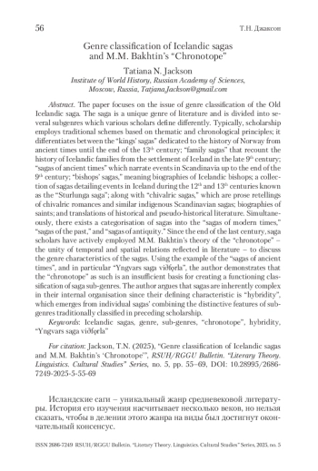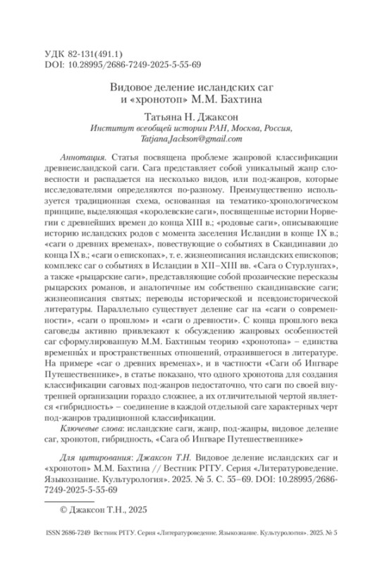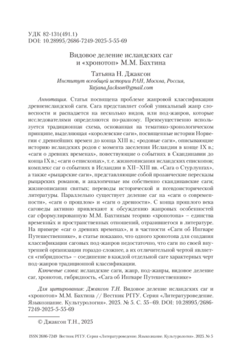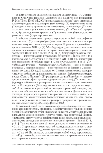 Статья посвящена проблеме жанровой классификации древнеисландской саги. Сага представляет собой уникальный жанр словесности и распадается на несколько видов, или под-жанров, которые исследователями определяются по-разному. Преимущественно используется традиционная схема, основанная на тематико-хронологическом принципе, выделяющая «королевские саги», посвященные истории Норвегии с древнейших времен до конца XIII в.; «родовые саги», описывающие историю исландских родов с момента заселения Исландии в конце IX в.; «саги о древних временах», повествующие о событиях в Скандинавии до конца IX в.; «саги о епископах», т. е. жизнеописания исландских епископов; комплекс саг о событиях в Исландии в XII–XIII вв. «Сага о Стурлунгах», а также «рыцарские саги», представляющие собой прозаические пересказы рыцарских романов, и аналогичные им собственно скандинавские саги; жизнеописания святых; переводы исторической и псевдоисторической литературы. Параллельно существует деление саг на «саги о современности», «саги о прошлом» и «саги о древности». С конца прошлого века саговеды активно привлекают к обсуждению жанровых особенностей саг сформулированную М. М. Бахтиным теорию «хронотопа» – единства временны́х и пространственных отношений, отразившегося в литературе. На примере «саг о древних временах», и в частности «Саги об Ингваре Путешественнике», в статье показано, что одного хронотопа для создания классификации саговых под-жанров недостаточно, что саги по своей внутренней организации гораздо сложнее, а их отличительной чертой является «гибридность» – соединение в каждой отдельной саге характерных черт под-жанров традиционной классификации.