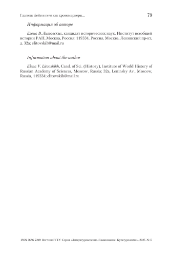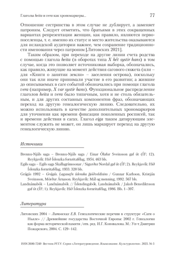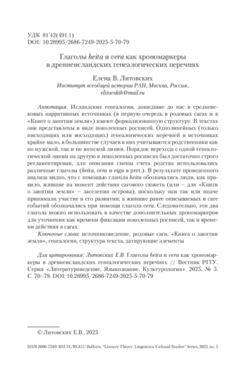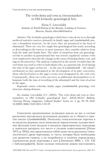 ЛИТОВСКИХ Е. ГЛАГОЛЫ HEITA И VERA КАК ХРОНОМАРКЕРЫ В ДРЕВНЕИСЛАНДСКИХ ГЕНЕАЛОГИЧЕСКИХ ПЕРЕЧНЯХ // ВЕСТНИК РГГУ. СЕРИЯ «ЛИТЕРАТУРОВЕДЕНИЕ. ЯЗЫКОЗНАНИЕ. КУЛЬТУРОЛОГИЯ». 2025. № 5