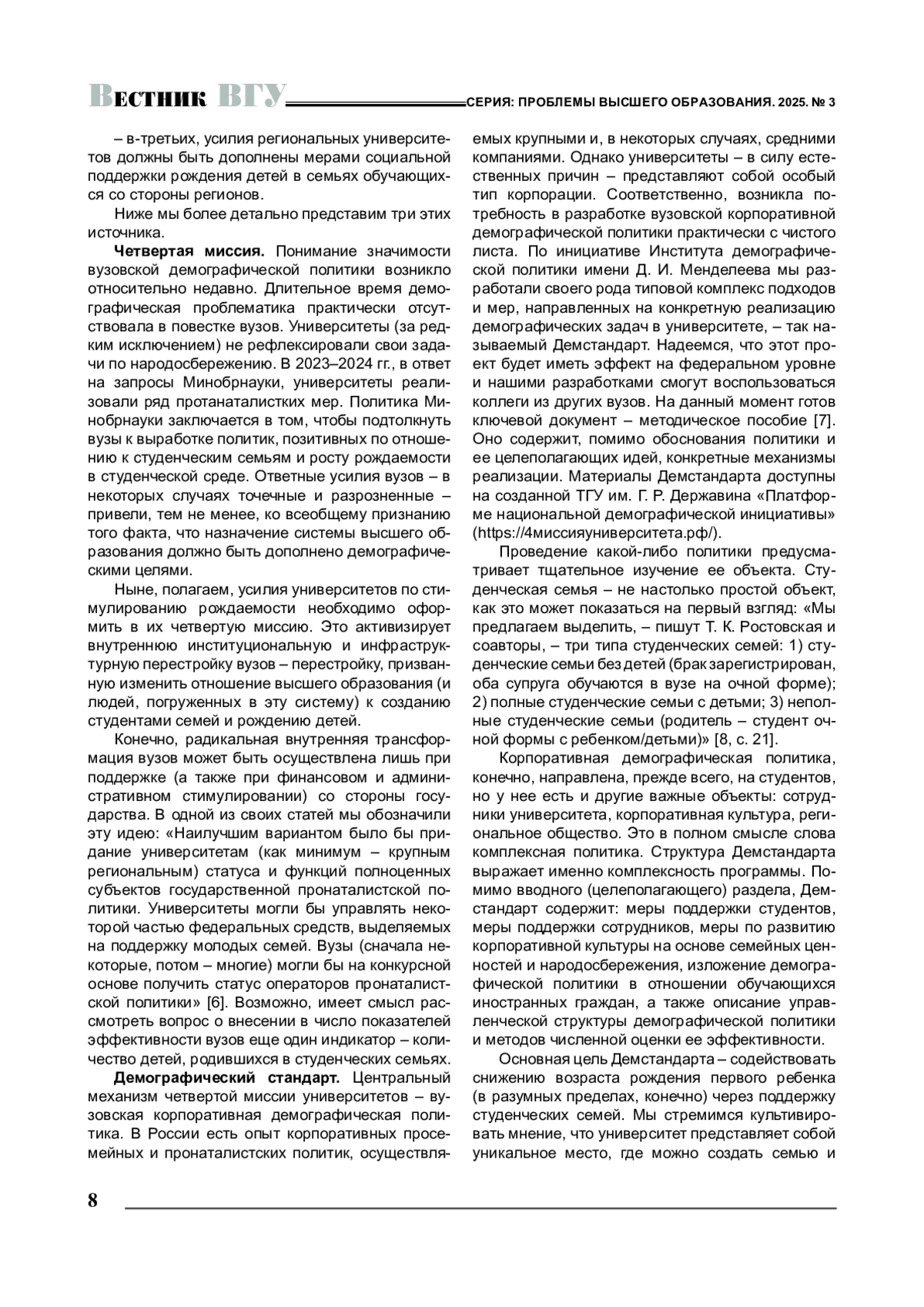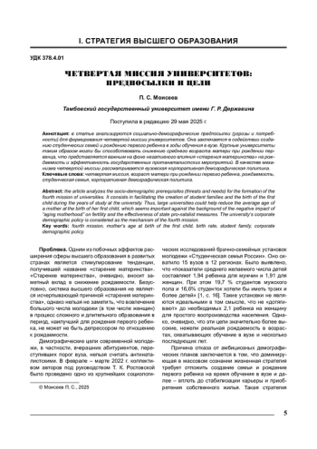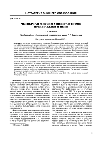 В статье анализируются социально-демографические предпосылки (угрозы и потребности) для формирования четвертой миссии университетов. Она заключается в содействии созданию студенческих семей и рождению первого ребенка в годы обучения в вузе. Крупные университеты таким образом могли бы способствовать снижению среднего возраста матери при рождении первенца, что представляется важным на фоне негативного влияния «старения материнства» на рождаемость и эффективность государственных протанаталистских мероприятий. В качестве механизма четвертой миссии рассматривается вузовская корпоративная демографическая политика.