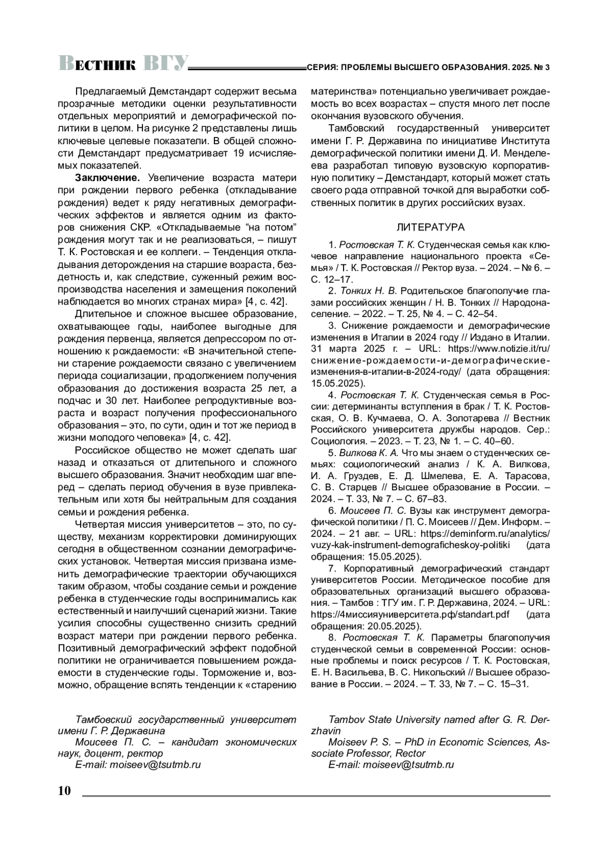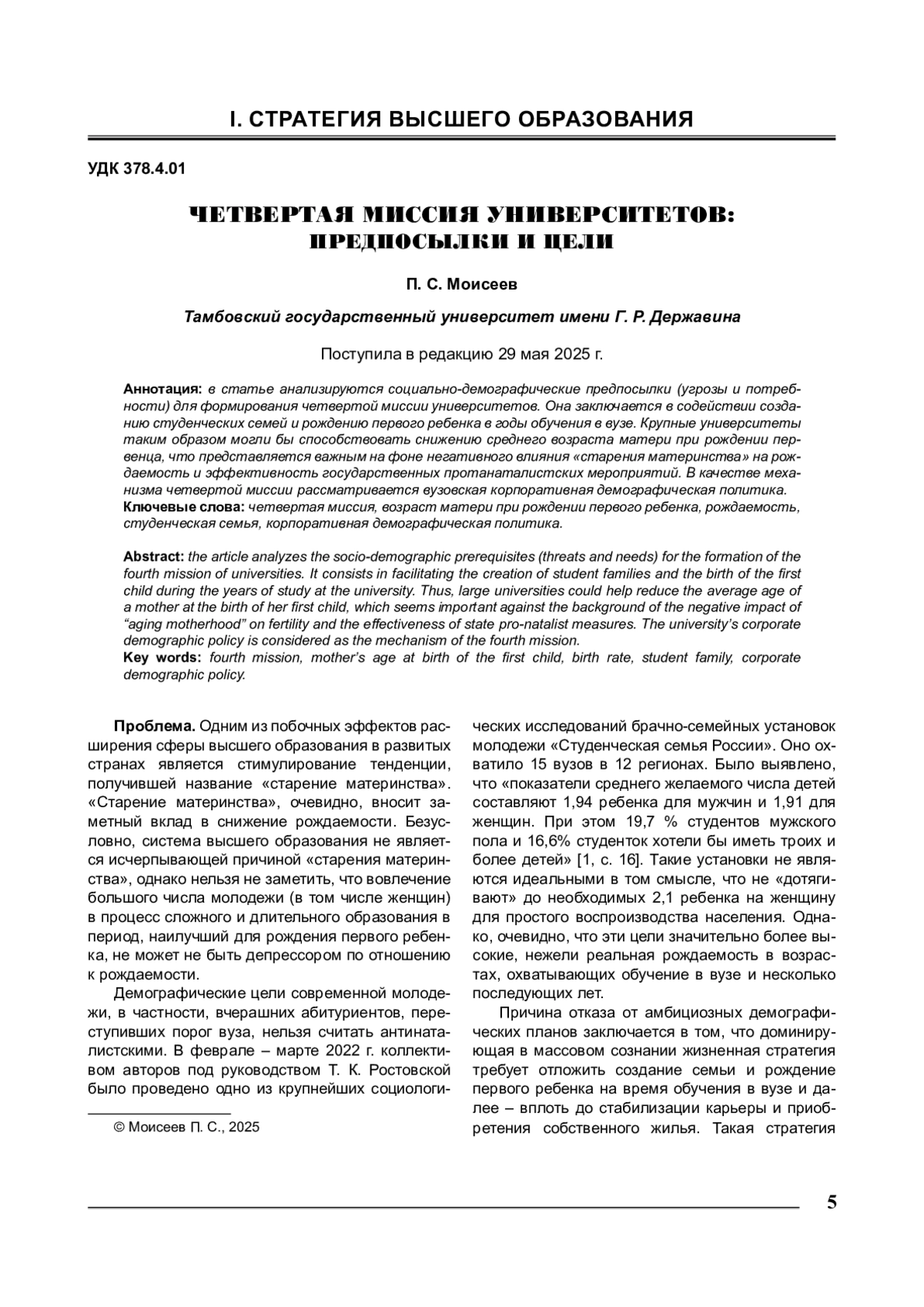 МОИСЕЕВ П. С. ЧЕТВЕРТАЯ МИССИЯ УНИВЕРСИТЕТОВ: ПРЕДПОСЫЛКИ И ЦЕЛИ // ВЕСТНИК ВОРОНЕЖСКОГО ГОСУДАРСТВЕННОГО УНИВЕРСИТЕТА. СЕРИЯ: ПРОБЛЕМЫ ВЫСШЕГО ОБРАЗОВАНИЯ. 2025. № 3