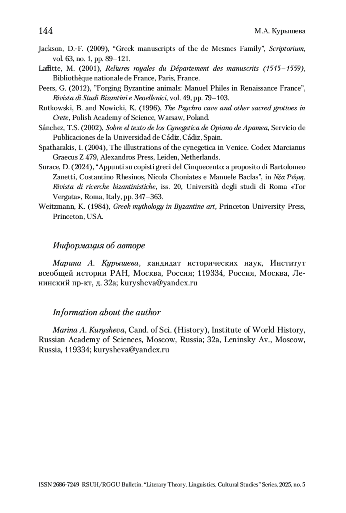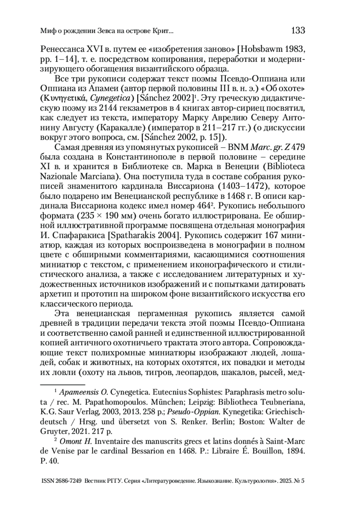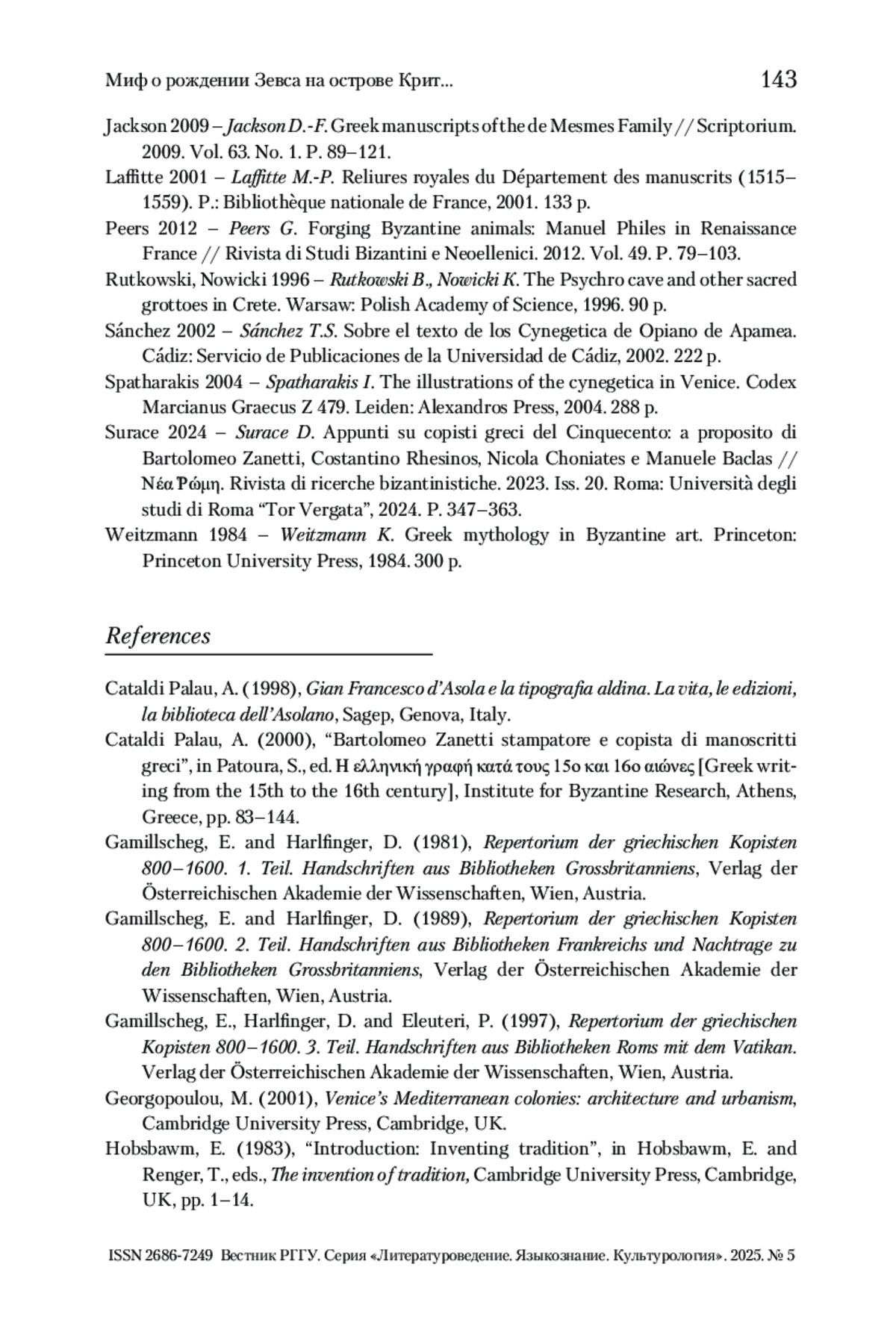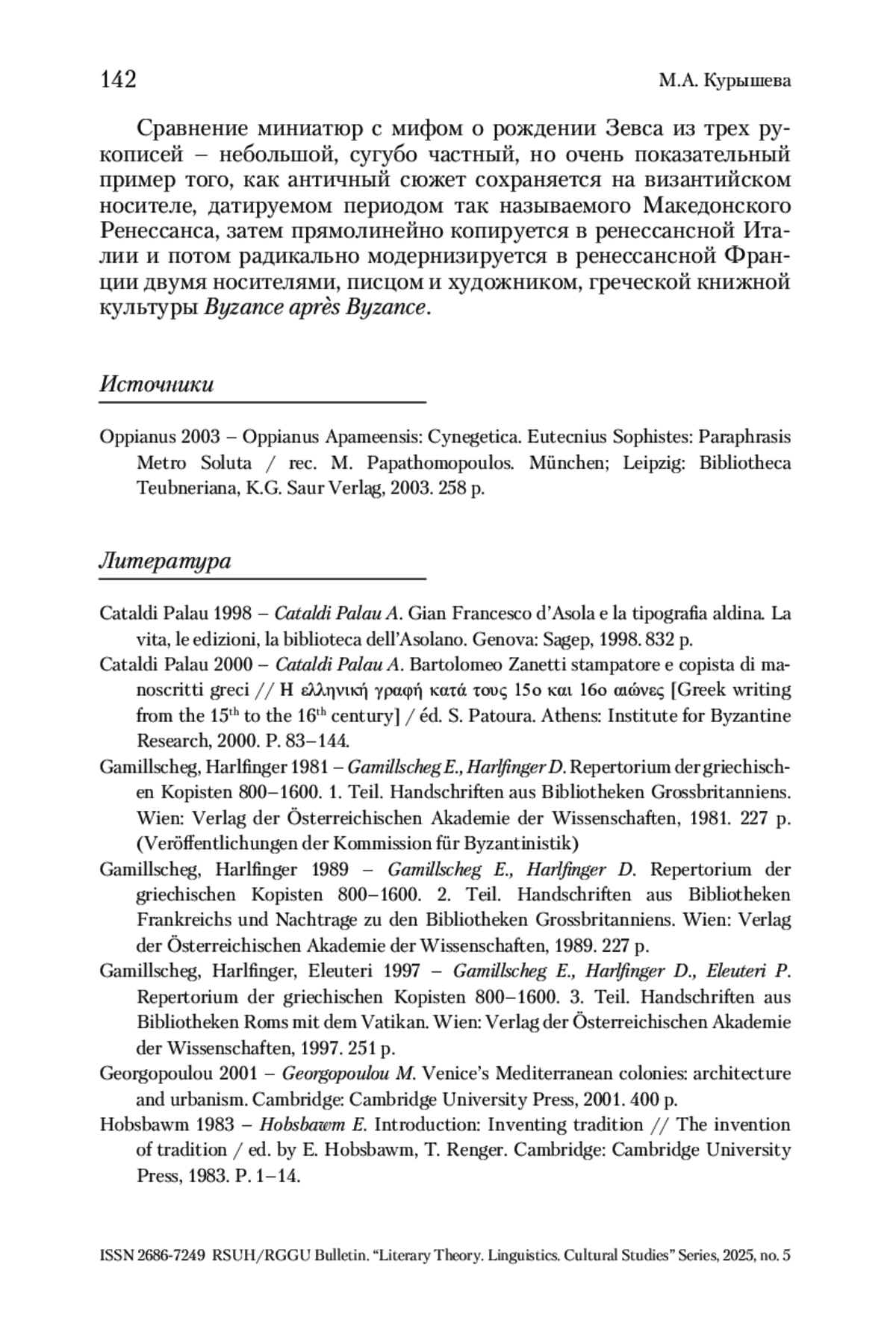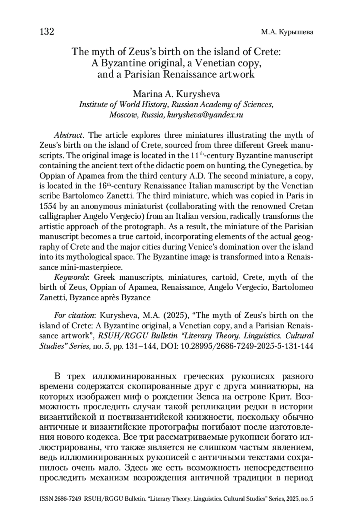 КУРЫШЕВА М. А. МИФ О РОЖДЕНИИ ЗЕВСА НА ОСТРОВЕ КРИТ: ВИЗАНТИЙСКИЙ ОРИГИНАЛ, ВЕНЕЦИАНСКАЯ КОПИЯ И ПАРИЖСКОЕ РЕНЕССАНСНОЕ ПРОИЗВЕДЕНИЕ // ВЕСТНИК РГГУ. СЕРИЯ «ЛИТЕРАТУРОВЕДЕНИЕ. ЯЗЫКОЗНАНИЕ. КУЛЬТУРОЛОГИЯ». 2025. № 5