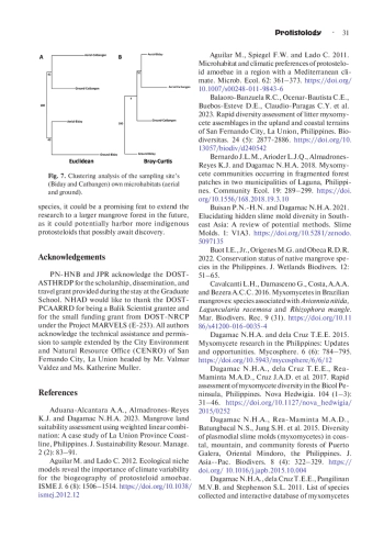 27. Macabago S.A.B., Dagamac N.H.A., dela Cruz T.E.E. and Stephenson S.L. 2017. Implications of the role of dispersal on the occurrence of litter-inha-biting myxomycetes in different vegetation types after a disturbance: a case study in Bohol Islands, Philippines. Nova Hedwigia. 104 (1-3): 221-236. DOI: 10.1127/nova_hedwigia/2016/0391